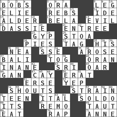 ACROSS 1. Moves up and down 5. Mouth or opening 8. Part of a journey 11. Writer Wiesel 12. Confederate soldiers (slang) 14. Binary compound 15. Tree or shrub in the Birch family 17. Actor Lugosi 18. Tending to cause great harm 19. Hyrax 21. Main course 23. Flimflam 25. Portico 26. Sliced desserts 27. Label 28. Part of HMS, perhaps 31. Teachers' org. 33. Compass dir. 35. Came up 37. Indonesian resort city 38. Coat; cloak 40. Northwest Algerian city 41. Lacking in sense or substance 43. Indian title of respect (Mr.) 45. Rowing implement 46. Separate the seeds from cotton 47. Island 50. Part of Q.E.F. 52. Celtic language 53. Slangy assent 54. Yells 56. Put through a sieve 61. Adolescent 62. Slanted text style (abbr.) 65. Twentieth part of a lira 66. ___ a Wonderful Life 67. San ____ (Riviera town) 68. Tense 69. Erode 70. Strike 71. Queen of England 1702-14 DOWN 1. Necklace unit 2. Water jar 3. Auction offers 4. Observes 5. Globe 6. To riddle 7. Most capable 8. Moving, as bait 9. Singer Brickell 10. Set 13. Before Barbara or Clara 16. Swiss mountan, "Queen of the Mountains" 18. Period 20. Sight organs 22. Ancient Roman robe 24. Inconspicuous attention getter 26. Ache 28. Israeli folk dance 29. Austrian river, tributary to the Danube 30. Elected rep. 31. Nanny 32. Enthusiasm 34. Greek goddess of the dawn 36. Carrot, for example 37. Massive 39. Jennifer or Joel 42. Shade of tan 44. Angers 48. Moving about 49. Last past 51. Flats, for short 52. Age 54. Bristle 55. Behest 57. Roll call or roster of names 58. Actor Alda or Thicke 59. Goddess of spring and wife of Bragi 60. Observe 61. Make a knot 63. Nursemaid (var.) 64. Chop off