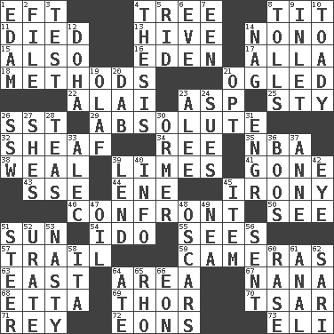 ACROSS 1. Bank Draft (abbr.) 4. Woody plant 8. Teat (slang) 11. Passed on 13. Hub of activity 14. Words to Nanette 15. In addition 16. Locale of original sin 17. Silent film actress Nazimova 18. Modes 21. Stared 22. Jai _ 23. Cleo's killer 25. Filthy place 26. Fast jet (abbr.) 29. Utter; complete 32. Bundle of cut stalks of grain 34. To sift 35. Basketball assoc. 38. Welt 39. Citrus fruits 41. Went 43. Compass dir. 44. Compass dir. 45. Literary sarcasm 46. Meet 50. Observe 51. Player for Phoenix 54. Wedding promise 55. Perceives with the eye 57. Drop behind 59. Devices for capturing images 63. 90 degrees 64. Length times width 67. Nanny 68. Singer James 69. Son of Odin 70. Russian ruler of old 71. Marina Del _, California 72. Immeasurably long periods of time 73. Biblical high priest DOWN 1. Dutch treat 2. Do some clerical work 3. Trial 4. College paper 5. To free from 6. First lady 7. Car or cant ending 8. For Whom the Bell _____ 9. An arm off of a larger body of water 10. Sycophant 12. Capital of the state of Qatar 14. Tired old horse 19. Norwegian king 20. Small moist lump or mass 21. Elect 23. Toward shelter 24. Takes to court 26. Compass dir. 27. "______ My Girl" (Turtles hit) 28. Afternoon social gatherings 30. Channel Islands abalone 31. Engineer (abbr.) 33. Actor Baldwin 36. Scornful sounds 37. Singer Murray 39. Grant temporary use of 40. A message received and understood 42. Sight organ 45. A whole individual unit 47. Lubricate 48. Motion picture awards 49. Teachers' org. 51. Guide 52. A salt of uric acid 53. Thoroughly unpleasant 56. Emitted 58. Call ___ day 60. To erase 61. Of or related to the anus 62. Indian skirt 64. Had dinner 65. 17th letter of the Greek alphabet 66. Age
