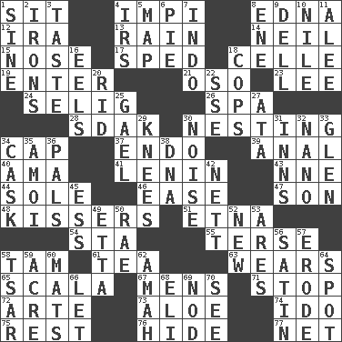 ACROSS 1. Be seated 4. Body of Kaffir warriors 8. Pulitzer Prize-winning author Ferber 12. Lyricist Gershwin 13. Precipitation 14. Famous astronaut Armstrong 15. Sense of smell 17. Moved rapidly 18. Cell (Danish) 19. Keyboard key 21. Bear (Spanish) 23. Area sheltered from the wind 24. Major League Baseball Commissioner Bud 26. Health resort 28. Neighbor of Neb. 30. Snuggling 34. Head covering 37. Inside; within (prefix) 39. Of or related to the anus 40. Housemaid (var.) 41. Soviet premier 1918-24 43. Compass dir. 44. Not divided or shared with others 46. Relaxation 47. Boy, to dad 48. Smoochers 51. Inactive volcano in Sicily 54. R.R. building 55. Laconic 58. Scottish cap 61. Beverage made from leaves 63. Erodes 65. Any of the three canals of the cochlea 67. Not women's 71. Close up, plug up 72. Johnson of "Laugh-In" 73. _ vera 74. Wedding promise 75. Repose 76. Flintstone garb 77. Fish or hair follower DOWN 1. Trig term 2. Metal shackles 3. Clothes sense 4. Big collection agency 5. Atlas unit 6. Sliced dessert 7. Southeast Asian peninsula 8. Compass dir. 9. Small valley 10. The longest river in the world 11. Toward shelter 16. Snakelike fish 18. 911 reaches them 20. To free from 22. Compass dir. 25. Highlander 27. "One Day ___ Time" 29. Leg joints 30. Annoying sound 31. Taverns 32. Billionth: prefix 33. Small, secluded valley 34. Keg 35. Mine, in Marseilles 36. Friends 38. Heredity factor (abbr.) 42. Remaining after all deductions 45. Double-curved letter 49. Singer James 50. Actress Charlotte 52. ___ Haven, CT 53. Ancient Greek god of war 56. Smooth fabric 57. Wear away 58. Russian ruler of old 59. Land measure 60. Floor coverings 62. Housemaid 64. Specific locale 66. Allow 68. Connecticut Ivy Leaguer 69. Dreamland 70. Perceive with the eye