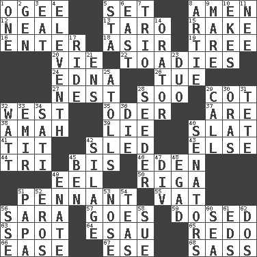 ACROSS 1. Double curve, resembling the letter S 5. Arrange properly for use 8. So be it 12. Be tempered by heat 13. Pacific island yam 15. Immoral or dissolute person 16. Keyboard key 18. SW Saudi Arabia district 19. Woody plant 20. Compete 22. Sycophants 24. Pulitzer Prize-winning author Ferber 26. Third day of the wk. 27. A home for chicks 28. "Barney Miller" actor Jack 29. Small bed 32. Compass direction 35. Baltic tributary 37. "We ___ not amused" (Victoria) 38. Nursemaid 39. Falsehood 40. Narrow board 41. Teat (slang) 42. Downhill vehicle 43. Otherwise 44. Three (prefix) 45. Twice 46. Genesis locale 49. Snakelike fish 50. Capital of Latvia 51. Pre-World Series prize 55. Large container 56. "Two Mules for Sister ____" 57. Travels 59. Administered medicine 63. Specific locale 64. Son of Isaac 65. Do over again 66. Relaxation 67. Compass dir. 68. Backtalk DOWN 1. Single 2. Commissioned mil. rank 3. Ingest 4. Veterans Day date 5. R.R. building 6. Compass direction 7. Musical group of three 8. Nick name for Arthur 9. Female horse 10. Supplements with great effort 11. Born 14. Speaker 17. Travel on or in a vehicle 21. Followers of ems 23. Superhero pair 25. Ringlike coral islands and reefs 28. Sowing specialist 29. Give a ring to 30. Mouths or openings 31. False hair 32. Electrical Unit 33. Independent ruler or chieftain 34. Suttee (variant) 36. Expire 40. Legislators 42. Fodder prepared in a silo 45. Benjamin's nick name 47. HTML Container Element 48. Mild oath 49. Related on the mother's side 51. Dad 52. Greek god of love 53. Sense of smell 54. Afternoon social gatherings 56. Compass dir. 58. Institute legal proceedings 60. Ocean 61. Begley and Asner 62. Two (Sp.)