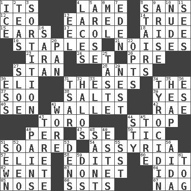 ACROSS 1. It is 4. Unable to walk 8. Without 12. Corporate head (abbr.) 13. Having ears or earlike features 14. Loyal 15. Hearing organs 17. Learning spot: Fr. 18. Assistant 19. Paper fasteners 21. Annoying sounds 23. Lyricist Gershwin 24. Put into a specified state 26. Before (prefix) 27. Comedian Laurel of Laurel & Hardy 28. Pismires 30. Connecticut Ivy Leaguer 31. College papers 34. Definite Article 37. "Barney Miller" actor Jack 38. Table seasonings 39. Consenting reply 40. Elected rep. 41. Place for singles 42. Actress Charlotte 43. "Corrida" creature 44. Discontinue 46. For each 47. Compass dir. 50. Nervous spasm 51. Flew 54. Nineveh was its capital 57. Writer Wiesel 58. Proofreads 60. Prepare for publication 62. Left 63. Music written for nine 64. Wedding promise 65. Characteristic smell of wine 66. Fast planes 67. Tired old horse DOWN 1. Frozen water 2. Afternoon social gatherings 3. Determination 4. Shoestrings 5. Came up 6. Cartoonist voice _ Blanc 7. Locale of original sin 8. Flight of steps 9. Get up 10. Unadorned 11. Observes 13. Snakelike fish 16. "Two Mules for Sister ____" 20. Baking dish 22. Elects 25. Clothes sense 27. A type of plum 29. Egg locale 30. Double-curved letter 31. Russian ruler of old 32. Rings 33. Pipe bend 34. Polypeptide antibiotic 35. Pile 36. Compass dir. 41. Had on 43. Cigar-shaped 44. Filthy place 45. Hoop that covers a wheel 46. Aches 48. Inhabitant of Heaven 49. _____ Park, CO 51. Stitched 52. Butter sub 53. Cub Scout units 55. Fast jet (abbr.) 56. Opera by Verdi 59. Two (Sp.) 61. Coat; cloak