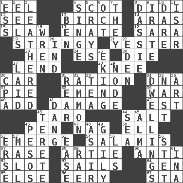 ACROSS 1. Snakelike fish 4. Highlander 8. "You Light Up My Life" star Conn 12. Perceive with the eye 13. A tree used for making furniture 14. Ancient river in northeast Turkey 15. Cole _ (cabbage dish) 17. Maternal 18. "Two Mules for Sister ____" 19. Slender, wiry 21. Next before 23. Layer 24. Compass dir. 26. Expire 27. Grant temporary use of 28. Leg joint 30. Auto 31. Food allowance for one day 34. Heredity factor (abbr.) 37. Sliced dessert 38. Make improvements or corrections to 39. Armed conflict 40. Say or write further 41. Break 42. Eastern Standard Time (abbr.) 43. Edible starchy tuberous root 44. Table seasoning 46. Animal enclosure 47. Tired old horse 50. Pipe bend 51. Develop 54. Deli grouping 57. To erase 58. Nick name for Arthur 60. Against 62. Slit 63. Moves on water 64. Commissioned mil. rank 65. Otherwise 66. Suggestive of the supernatural 67. R.R. building DOWN 1. Curvy letter 2. Snakelike fish 3. Tough but pliablecoriaceous 4. Scorch 5. Trading vessels 6. Sep. follower 7. Those things 8. Small ungulate mammals of Africa 9. Feeling or showing extreme anger 10. Have the gumption 11. Austrian river, tributary to the Danube 13. Benjamin's nick name 16. Songbird 20. Indiana (abbr.) 22. Genesis locale 25. Supplementing with great effort 27. Put down 29. Thickened enlargement 30. Accounting whiz (abbr.) 31. Posterior 32. ID or VA city 33. Afternoon social gathering 34. Homes 35. Political cartoonist Thomas 36. Tate display 41. Mild oath, euphamism for damn 43. Cigar-shaped 44. Ocean 45. _ mater 46. Mexican monetary units 48. Moving about 49. Lightheartedly 51. Celtic language 52. Shopping center 53. Relaxation 55. French article 56. Proofreading order 59. Actress Charlotte 61. _ tizzy (2 wds.)