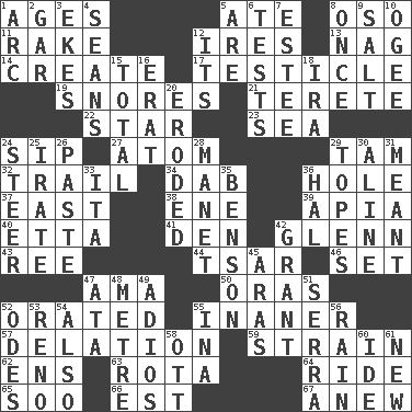 ACROSS 1. Matures 5. Had dinner 8. Bear (Spanish) 11. Libertine 12. Angers 13. Tired old horse 14. Cause to be 17. A testis 19. Sounds asleep 21. Cigar-shaped 22. Play the lead 23. Ocean 24. Small drink 27. Tiny particle 29. Scottish cap 32. Hang back 34. Pat or tap gently 36. Hollow 37. Compass direction 38. Compass dir. 39. Capital of Western Samoa 40. Singer James 41. Lair 42. American astronaut and politician John 43. To sift 44. Russian ruler of old 46. Put into a specified state 47. Nanny (var.) 50. Mouths or openings 52. Spoke pompously 55. More lacking in sense or substance 57. Accusation by an informer 59. Put through a sieve 62. Followers of ems 63. Round or rotation of duties 64. Travel on an animal 65. "Barney Miller" actor Jack 66. Eastern Standard Time (abbr.) 67. Afresh DOWN 1. Curve 2. Slender fish 3. Supplements with great effort 4. Actors Connery and Penn 5. "We ___ not amused" (Victoria) 6. Trials 7. First name in cosmetics 8. At one time in the past 9. Table seasoning 10. Double curve, resembling the letter S 12. It is 15. "_____ Recall" 16. Part of Q.E.F. 18. Lyricist Gershwin 20. Eaten away 24. Navigate 25. Feeling or showing extreme anger 26. Thick mixture 28. French painter Edouard 29. Drinks excessively 30. Place in a line 31. Intended 33. Call ___ day 35. Gillaume's butler role 36. Actor Linden 42. Monetary aid 45. Caspian sea tributary 47. _ moment's notice (2 wds.) 48. Distance measurement (Brit.) 49. Goodbye (Sp.) 51. Spanish missionary in California 52. Lyric poems 53. Former U.S. Attorney General Janet 54. In addition 55. _ tizzy (2 wds.) 56. Water falling in drops from the sky 58. Baseball player Mel 60. Binary compound 61. ___ Haven, CT