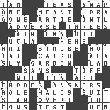 ACROSS 1. Scottish cap 4. Afternoon social gatherings 8. Fastener 12. Single 13. Intended 14. Israeli folk dance 15. Went 17. Nick name for Arthur 18. International (abbr.) 19. Contrary to your interests or welfare 21. Trios 23. Atmosphere 24. Followers of ems 26. Baseball player Mel 27. Southern CA. univ. 28. Cloth borders 30. Medical imaging device (abbr.) 31. Disco prop 34. Being at a high temperature 37. Make lace 38. Capital of Egypt 39. According to 40. Wily 41. Place where plants grow 42. Experiment locale 43. Without 44. Small quarrel 46. Fish or hair follower 47. ___ a Wonderful Life 50. Nonscientific branch of learning 51. Eats (away) 54. Replies 57. Hero or heavy, e.g. 58. Rings 60. Costume for a special activity 62. Play the lead 63. Unconcealed 64. Three (prefix) 65. Immeasurably long periods of time 66. Trial 67. Layer DOWN 1. Coat; cloak 2. Small Philippine buffalo 3. Ananias' fault 4. Laconic 5. Eroded 6. Black tropical American cuckoo 7. Proofreading order 8. Upper-body garments 9. Music written for nine 10. Johnson of "Laugh-In" 11. Friends 13. Spoil 16. Morally bad or wrong 20. Epoch 22. Dwelling 25. Dinah or Pauly 27. Mountain range 29. Inky black, to poets 30. Mountains (abbr.) 31. Examine hastily 32. Tarsus (plural) 33. To free from 34. Not exactly gospel 35. Norwegian king 36. Bar bill 41. Yard entry 43. Spring feasts 44. The 23rd letter of the Hebrew alphabet 45. Angers 46. Pitcher Ryan 48. Stories 49. Derisive sound 51. Celtic language 52. Printing process, for short 53. Guess 55. Fast jet (abbr.) 56. Beget 59. "___ Maria" 61. Shallow baking pan