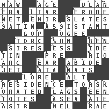 ACROSS 1. Opening into something insatiable 4. Mature 7. ____ Bator 11. Epoch 12. One who doesn't tell the truth 13. Wear away 14. Fish or hair follower 15. Arab leader 16. Chalkboards 17. Smooth fabric 19. Aide 21. Republican Party 23. Double curve, resembling the letter S 24. Torque (variant) 25. Player for Phoenix 26. Benjamin's nick name 29. Begets 30. Double-curved letter 31. Binary compound 32. Shallow baking pan 33. Before (prefix) 34. River (Sp.) 35. Curve 36. Hearing organ 37. Remain 40. Passenger plane 41. "One Day ___ Time" 42. Floor coverings 43. Old wives' tales, e.g. 45. Keyboard modifier key 46. Dwelling 51. Cod relative 55. Declaimed 56. Straggles 58. Car or cant ending 59. Hauls 60. At sea 61. Had dinner 62. SW Saudi Arabia district 63. Cartoonist voice _ Blanc 64. Actress Charlotte DOWN 1. Not women's 2. Type of rug 3. Electrical Unit 4. Direct toward a target or goal 5. Greek goddess of the earth (variant) 6. Blunders 7. A salt of uric acid 8. Globular water bottle used in Asia 9. An important port of Yemen 10. A home for chicks 12. Poe poem 13. Otherwise 16. Signals 18. Russian composer Stravinsky 20. Boozer 22. Personal Computers (abbr.) 24. Tinged 25. Spanish missionary in California 26. Avian creatures 27. Singer Brickell 28. Modern: prefix 29. Male parent of an animal 32. _ Mahal 33. Eucharist need 36. Having ears or earlike features 37. Nursemaid (var.) 38. Greek mezzo-soprano Agnes 39. "Tell ____ the Marines!" 43. 61 cubic inches 44. Lyric poems 46. Roll call or roster of names 47. Greek god of love 48. Suttee (variant) 49. Dollar (slang) 50. Relaxation 52. Stern 53. Stalk of a moss capsule 54. Leg joint 57. Set