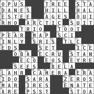 ACROSS 1. Musical composition 5. Woody plant 9. R.R. building 12. Natives or inhabitants of Denmark 14. Land elevation 15. Actor Linden 16. First name in cosmetics 17. Ripens 18. Fr. "Yes" 19. 17th letter of the Greek alphabet 20. Northern region 23. Set or collection 24. Musical group of three 25. A blast of a horn 27. Lightbulb-shaped fruit 30. Atlas unit 32. _-fi 33. In an inward manner 34. Indian titles of respect 36. Affectionate concern, for short 38. Begley and Asner 39. Arrange properly for use 40. Frozen water 43. Chief or king in Benin or Nigeria 46. Shade of tan 48. Comedian Laurel of Laurel & Hardy 49. Environmental prefix 51. Greek goddess of the dawn 52. Jane of fiction 53. Observes 54. Actor Lugosi 56. Cowardly lion portrayer 58. Device for capturing images 61. Period 64. Wedding promise 65. "Two Mules for Sister ____" 66. Nothings 68. Impair 69. Angers 70. Related on the mother's side 71. "We ___ not amused" (Victoria) 72. Inconspicuous attention getter 73. Portico DOWN 1. Baltic tributary 2. Romantic infatuation 3. To (old English) 4. Perceive with the eye 5. Not this but _ 6. Swiss mountan, "Queen of the Mountains" 7. Chooses 8. Raised railways 9. Yell 10. "Change" in Tahitian 11. Came down and settled, as after flight 13. Shrivel 21. Basketball hoops 22. Rough 23. The visible part of the earth's surface 24. Attempt 26. Sep. follower 27. Sliced dessert 28. Conclude 29. In addition 31. Part 35. Disco prop 37. Municipality 41. Automobile 42. Compass dir. 44. Fermented drink made from hops 45. Adept person 47. One who makes use of a thing 48. Ocean 50. Motion picture awards 53. Dinah or Pauly 55. Goldbrick 56. Pale green bean 57. The sixth month of the Jewish calendar 59. Ancient Greek god of war 60. Vertical spar for supporting sails 61. Part of Q.E.F. 62. Printing process, for short 63. At sea 65. Small drink 67. Followers of ems