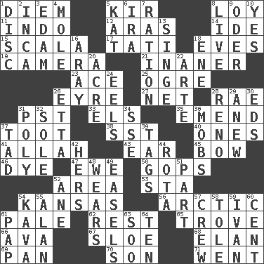 ACROSS 1. South Vietnam president (1954) 5. Apertif with cassis 8. Myrna of the movies 11. _ china 12. Caspian sea tributary 14. Binary compound 15. Any of the three canals of the cochlea 17. Jacques of French films 18. Nights before holidays 19. Device for capturing images 21. Sillier 23. Adept person 25. Legendary monster 26. Jane of fiction 27. Fish or hair follower 28. Actress Charlotte 31. Pacific Standard Time (abbr.) 33. Raised railways 35. Make improvements or corrections to 37. A blast of a horn 38. Fast jet (abbr.) 40. Singles 41. Assad's deity 43. Hearing organ 45. Ribbon knot 46. Color 47. She-sheep 50. Republicans 52. Type of rug 53. R.R. building 54. Sunflower state 56. Northern region 61. Diluted with white 62. Respite 65. Collection of objects 66. Actress Gardner 67. _ gin 68. Flair 69. Baking dish 70. Manchild 71. Left DOWN 1. Plate 2. South American Indian 3. Dutch treat 4. Undercover agent 5. Krazy ___ of comics 6. Retirement account (abbr.) 7. Food allowance for one day 8. Not recorded 9. Baltic tributary 10. It is so 13. Scorch 16. Like ___ of sunshine 18. Compass dir. 20. 43,560 square feet 22. Johnson of "Laugh-In" 24. Snakelike fish 26. Singer James 28. Western Nevada city 29. Afresh 30. Begley and Asner 31. Much (prefix) 32. Not divided or shared with others 34. Compass dir. 36. Disorderly crowds 37. Small boy 39. Labels 42. Possessive pronoun 44. Roll call or roster of names 48. Erodes 49. Artist's stands 51. Role in a play 52. One (Scot) 54. Polynesian shrub of the pepper family 55. Actor Alda or Thicke 57. Group working together 58. Lacquered or enameled metalware 59. _ the terrible 60. Penny 61. Infant food 63. "Barney Miller" actor Jack 64. "___ Little Indians"