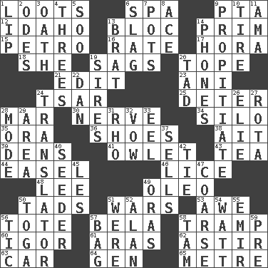 ACROSS 1. Plunders 6. Health resort 9. Parent Teacher Assoc. 12. Potato state 13. Alliance 14. Demure 15. Stone: prefix 16. Assign a rank or rating to 17. Israeli folk dance 18. A female animal or person 19. Settles 20. Drink excessively 21. Prepare for publication 23. Cuckoo 24. Russian ruler of old 25. Prevent from occurring 28. Impair 30. Impudent aggressiveness 34. Grain storage tower 35. Mouth or opening 36. Imelda's hoard 38. Small island 39. Hiding places for outlaws 41. A small or young owl 43. Beverage made from leaves 44. Artist's stand 46. Louse (plural) 48. Area sheltered from the wind 49. Butter sub 50. Small amounts or degrees 51. Armed conflicts 53. Deep reverence 56. Carryall 57. Actor Lugosi 58. _____ steamer (cargo ship) 60. Russian composer Stravinsky 61. Caspian sea tributary 62. Moving or stirring 63. 4-wheeled motor vehicle 64. Commissioned mil. rank 65. Distance measurement (Brit.) DOWN 1. Mouth edge 2. Lyric poems 3. Pledge 4. Threesomes 5. "Barney Miller" actor Jack 6. Volcanic refuse 7. Plant holders 8. Adept person 9. Appease 10. Hoop that covers a wheel 11. Wet nurse (var.) 13. Naughty child 14. Gives a jingle 19. Founders of families 20. Bit 22. Daniel's nick name 24. Interpreter 26. Writer Wiesel 27. Round or rotation of duties 28. Method 29. Type of rug 31. 17th letter of the Greek alphabet 32. Promise 33. Snakelike fish 37. Makes a sale 40. Sowing specialist 42. Make a knot 45. French article 47. Rough 49. Mouths or openings 50. Ancient Roman robe 51. We are 52. ____ Jay Lerner 54. Electrical Unit 55. Independent ruler or chieftain 56. Nervous spasm 57. Paper or plastic container 58. Scottish cap 59. Before (prefix)