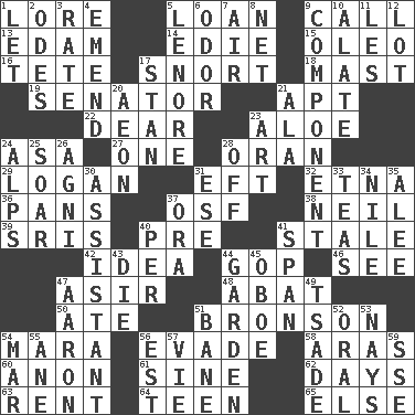 ACROSS 1. Old wives' tales, e.g. 5. Grant temporary use of 9. Give a ring to 13. Dutch treat 14. Singer Brickell 15. Butter sub 16. False hair 17. Derisive sound 18. Vertical spar for supporting sails 19. Elected representative 21. Fitting 22. Letter starter 23. Medicinal plant 24. White ___ sheet 27. Single 28. Northwest Algerian city 29. Utah city north of Ogden 31. Newt 32. Inactive volcano in Sicily 36. Baking dishes 37. Order of Saint Francis (abbr.) 38. Famous astronaut Armstrong 39. Indian titles of respect 40. Before (prefix) 41. Having lost freshness 42. It may be bright or harebrained 44. Grand Old Party 46. Perceive with the eye 47. SW Saudi Arabia district 48. Blind as ____ 50. Had dinner 51. "Death Wish" actor 54. Hindu Mythology: god of death 56. Elude 58. Caspian sea tributary 60. At once, immediately (arch.) 61. Trig term 62. 24-hour periods 63. Monthly bill 64. Adolescent 65. Otherwise DOWN 1. Allow 2. Lyric poems 3. Assign a rank or rating to 4. Make improvements or corrections to 5. Poe poem 6. Aroma 7. Wind 8. Fish or hair follower 9. Piece 10. Having winglike extensions 11. French article 12. Car dealer's back yard 17. Comedian Laurel of Laurel & Hardy 20. Age 21. Wing 23. Nonscientific branch of learning 24. High mountains 25. Fly high 26. Hindu god of fire 28. Not in operation 30. Helper 31. Compass dir. 33. Beverages made from leaves 34. "Death on the ____" 35. Toward shelter 37. Mouth or opening 40. For each 41. Connect, as a bridge 43. Pass on 44. Place where plants grow 45. Mitch Miller's instrument 47. Composer Copland 49. Sadhe (variant) 51. Object of repulsion 52. Taken by mouth 53. Negative votes 54. Impair 55. A saturated hydrocarbon 56. Eastern Standard Time (abbr.) 57. Compete 59. Compass dir.
