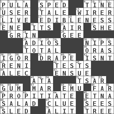 ACROSS 1. Monetary unit of Botswana 5. Hurried 9. Prong on a fork 13. One who makes use of a thing 14. Falsehood 15. One who wires 16. Moving, as bait 17. The property of being fit to eat 19. Compass dir. 20. It is 21. Wind 22. A female animal or person 23. Smile widely 25. Turn to the right 26. Goodbye (Sp.) 30. Pinches, bites 34. Add up to 35. Mouths or openings 36. Composer Stravinsky 39. Window treatment 42. Is not 43. Painter Guido (1575-1642) 44. Trials 46. Actor Baldwin 47. Take place subsequently 48. _ moment's notice (2 wds.) 51. Russian ruler of old 54. Chewing product 57. Spoil 58. Australian flightless bird 60. At a great distance 62. Conciliate 65. Inactive volcano in Sicily 66. Vegetable dish 67. A slight indication 68. Observes 69. Downhill vehicle 70. Came down and settled, as after flight 71. Woody plant DOWN 1. Whimper 2. Putting into practice 3. Crowbar 4. "We ___ not amused" (Victoria) 5. Proofreading order 6. Writing tablets 7. Biblical high priest 8. Debunk (Brit. slang) 9. Shallow baking pan 10. Angers 11. Delicate 12. Celtic language 15. We are 18. Untruth 20. Southeast Asian peninsula 24. Of or pertaining to medicine 27. It would 28. Rowing implement 29. Schedule 30. Annoying sounds 31. Big collection agency 32. Baking dish 33. Fast jet (abbr.) 36. Retirement account (abbr.) 37. Set 38. Single 40. Animal enclosure 41. Double-curved letter 45. Ballerina skirt 48. Among 49. Make lace 50. N. Chile seaport 52. Following 53. Indian princess (variant) 54. Global Positioning Systems (abbr.) 55. Mountain range 56. Undercover agent 58. Needle case 59. Rendezvous 61. To erase 63. Groovy apt. 64. 100% 65. Eastern Standard Time (abbr.)
