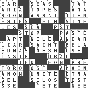ACROSS 1. Hearing organ 4. Oceans 8. Make lace 11. Roberta Peters solo 13. Drinks excessively 15. Nanny (var.) 16. Within a short period 17. Slender Brazilian palm 18. A distinct part 19. _____ Park, CO 21. Shade tree 22. Trig term 23. French article 24. Ocean 27. Pacific Standard Time (abbr.) 29. Close up, plug up 30. Thick mixture 34. Fitting 36. Mediterranean tributary 39. Approach 40. One who doesn't tell the truth 41. Virtuous person 43. Actor Lugosi 44. Ferber et al. 46. Tender 47. Purpose 48. Clothes sense 49. Mountain range 51. "___ Little Indians" 53. A really long time 54. Before (prefix) 57. "Corrida" creature 60. Order of Saint Francis (abbr.) 63. With great haste 65. Soon (poet.) 66. Join together 69. Inactive volcano in Sicily 70. Set 71. Grain storage towers 72. Trial 73. Compass dir. 74. Wig 75. Born DOWN 1. Artist's stand 2. Came up 3. Debaucheries 4. R.R. building 5. Greek goddess of the dawn 6. Domed church section 7. Lick closed 8. Jacques of French films 9. So be it 10. Not wild 12. One (Scot) 14. Simple or foolish person 18. Byzantium, centuries later 20. Fast jet (abbr.) 25. Immeasurably long periods of time 26. Bee-related 28. Health resort 29. Ski resort town in Vermont 31. Observes 32. Falsehood 33. Epoch 34. Opera by Verdi 35. Baking dishes 37. Whopper 38. Take place subsequently 40. Allow 42. Through, poetically 45. Perceive with the eye 50. Santa ___, CA 52. Common sense 54. Eucharist need 55. Wash lightly 56. Maternal 57. Labels 58. Singles 59. Hero or heavy, e.g. 61. In a ____ (agitated or irritated) 62. Do some clerical work 64. Was introduced to 67. Small child 68. Compass dir.