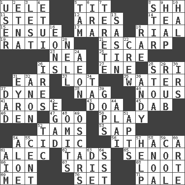 ACROSS 1. Ubangi River tributary 5. Teat (slang) 8. Quiet! 11. Proofreading order 12. Ancient Greek god of war 14. Beverage made from leaves 15. Take place subsequently 17. Hindu Mythology: god of death 18. Monetary unit of Yemen 19. Food allowance for one day 21. Fortification 23. Teachers' org. 25. Hoop that covers a wheel 26. Capri or Wright 27. Compass dir. 28. _ Lanka 31. Ewer handle 33. Car dealer's back yard 35. Wetness 37. Unit of force 38. Tired old horse 40. Good sense 41. Came up 43. ___ good deed 45. Apply (a substance) by light strokes 46. Lair 47. Thick or sticky substance 50. Frolic 52. Scottish caps 53. Plant excrement 54. Being or containing an acid 56. New York city 61. Actor Baldwin 62. Small boys 65. Sir (Sp.) 66. Electrically charged atom 67. Indian titles of respect 68. Spoils 69. Was introduced to 70. Arrange properly for use 71. Light colored DOWN 1. One who makes use of a thing 2. Inactive volcano in Sicily 3. For fear that 4. Needle case 5. Scottish cap 6. Lyricist Gershwin 7. Cylindrical with tapered ends 8. Move through with a circular motion 9. Pile 10. Actor Linden 13. Indian antelope 16. Immeasurably long periods of time 18. Actress Charlotte 20. 1994 drama film starring Jodie Foster 22. Ship's personnel 24. A really long time 26. Angers 28. Portico 29. Reuben's nickname 30. Big collection agency 31. Jane of fiction 32. At once, immediately (arch.) 34. Small amount or degree 36. "60 Minutes" Commentator Rooney 37. June honoree 39. Republicans 42. Mild oath 44. Jai _ 48. Leaves out 49. Motion picture awards 51. Flats, for short 52. Nervous spasm 54. _ vera 55. Penny 57. Assist 58. Small Philippine buffalo 59. Calm and collected 60. Johnson of "Laugh-In" 61. Direct toward a target or goal 63. Pass on 64. Fast jet (abbr.)