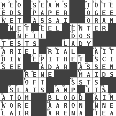 ACROSS 1. Modern: prefix 4. Seines 9. Carryall 13. Begley and Asner 14. Some stationery 15. Double curve, resembling the letter S 16. Dripping 17. Slender Brazilian palm 18. NW Algerian seaport 19. Fish or hair follower 21. Snakelike fish 22. Keyboard key 24. Famous astronaut Armstrong 26. Two (Sp.) 27. Trials 29. Kenny Rogers chart-topper in '80 30. Satellite of Uranus 31. Monetary unit of Yemen 33. Small island 36. HTML Container Element 37. Curse 40. _-fi 41. Perceive with the eye 42. The sixth month of the Jewish calendar 43. NE Netherlands city 45. French philosopher Descartes 47. Women servants 48. Often (poetically) 49. Fast planes 50. Narrow boards 52. Electrical Unit 54. ___ a Wonderful Life 56. Tiny particle 57. Vital fluid 59. The 18th letter of the Arabic alphabet 61. Had on 62. Composer Copland 63. Compass dir. 64. Den 65. Sports stadium 66. Afternoon social gathering DOWN 1. ___ Haven, CT 2. Paradise 3. Clearly or manifestly demonstrative 4. Health resort 5. Artist's stand 6. Domed church section 7. Anneal 8. _ Lanka 9. Tootsie (variant) 10. Legendary monster 11. Pull into pieces 12. Car or cant ending 20. Wig 22. Peak District village in England 23. Allow head to fall sleepily 25. Capri or Wright 27. Bits 28. One of the Great Lakes 29. Cowardly lion portrayer 31. Travel on an animal 32. Call ___ day 33. Helper 34. On the rocks 35. Canisters 38. Leg coverings 39. Scottish caps 44. Suttee (variant) 45. Nomad 46. Bank Draft (abbr.) 49. Soup utensil 50. Portico 51. Australian parrot (variant) 52. Having or resembling wings 53. Greater amount 55. Trig term 56. Leather borer 57. Sound made by sheep 58. Heredity factor (abbr.) 60. Teachers' org.