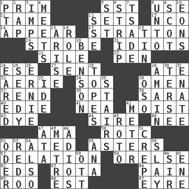 ACROSS 1. Demure 5. Fast jet (abbr.) 8. Purpose 11. Not wild 12. Arranges properly for use 13. Non-commissioned officer (abbr.) 14. Become visible 17. Ski resort town in Vermont 19. Disco prop 21. Foolish or stupid persons 22. Filth; sediment 23. Fenced enclosure 24. Compass dir. 27. Transmitted 29. Had dinner 32. Nest on high 34. Distress signal 36. Sign of something about to happen 37. Tear apart 38. Elect 39. "Two Mules for Sister ____" 40. Singer Brickell 41. Teachers' org. 42. Wet 43. Color 44. Beget 46. Born 47. Wet nurse (var.) 50. College mil. group 52. Spoke pompously 55. Michaelmas daisies 57. Conveyance 59. Threatening words 62. Begley and Asner 63. Roll call or roster of names 64. Ache 65. Friend of Pooh 66. Eastern Standard Time (abbr.) 67. Jane of fiction DOWN 1. Parent Teacher Assoc. 2. Reproach for some lapse or misdeed 3. Naughty children 4. Confronts 5. Put into a specified state 6. Long narrow piece of something 7. Sadhe (variant) 8. To (old English) 9. Native of Scotland 10. Immeasurably long periods of time 12. Compass dir. 15. Originate 16. Hero or heavy, e.g. 18. Metal container 20. Gillaume's butler role 24. Having ears or earlike features 25. Morally degraded 26. Bert's buddy 28. Drinks excessively 29. With great haste 30. Laconic 31. Maternal 33. Binary compound 35. Flight of steps 36. Bear (Spanish) 42. Distance measurement 45. Printing process, for short 47. _ moment's notice (2 wds.) 48. Distance measurement (Brit.) 49. Goodbye (Sp.) 51. Streamer paper 52. River in Europe 53. Make new 54. In addition 55. Santa ___, CA 56. Kill 58. Baseball player Mel 60. Title for a knight 61. Compass dir.