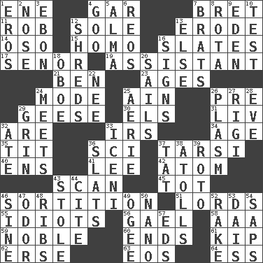 ACROSS 1. Compass dir. 4. Slender fish 7. Cy Young winner Saberhagen 11. Director Reiner 12. Flatfish 13. Wear away 14. Bear (Spanish) 15. Like (prefix) 16. Chalkboards 17. Sir (Sp.) 19. Helper 21. Benjamin's nick name 23. Grows older 24. Method 25. The 18th letter of the Arabic alphabet 26. Before (prefix) 29. Honkers 30. Raised railways 31. 54 in ancient Rome 32. "We ___ not amused" (Victoria) 33. Big collection agency 34. Mature 35. Teat (slang) 36. _-fi 37. Tarsus (plural) 40. Followers of ems 41. Area sheltered from the wind 42. Tiny particle 43. Skim 45. Small child 46. Decision 51. Domineers 55. Foolish or stupid persons 56. Highlander 58. American Automobile Association (abbr.) 59. Having high moral qualities 60. Conclusions 61. Sleep 62. Celtic language 63. Greek goddess of the dawn 64. Curvy letter DOWN 1. Greek god of love 2. Olfactory organ 3. Inky black, to poets 4. Thick or sticky substance 5. _ mater 6. Vintage cars 7. Naughty children 8. Roll call or roster of names 9. Genesis locale 10. Trial 12. Fragments 13. Otherwise 16. Signals 18. Mitch Miller's instrument 20. Travel by water 22. Born 24. Confronts 25. Nest on high 26. Suffix with ecto or cyto 27. Swiss mountan, "Queen of the Mountains" 28. First lady 29. Broad smile 32. Had dinner 33. Ancient Celtic tribe of eastern Britain 36. Narrow boards 37. Make lace 38. Ringlike coral islands and reefs 39. Printing process, for short 43. Fur scarf 44. Quote 46. Trig term 47. Scent 48. Chest bones 49. Double curve, resembling the letter S 50. Billionth: prefix 52. Libertine 53. Raised platform 54. Plant excrements 57. Begley and Asner