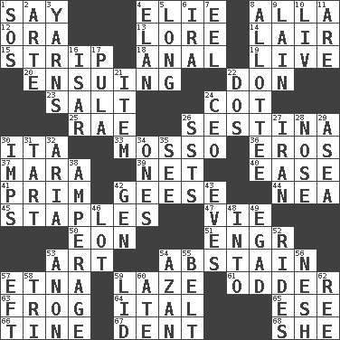 ACROSS 1. Declare 4. Writer Wiesel 8. Silent film actress Nazimova 12. Mouth or opening 13. Old wives' tales, e.g. 14. Den 15. Empty completely 18. Of or related to the anus 19. Moving, as bait 20. Following as a consequence or result 22. Spanish title 23. Table seasoning 24. Small bed 25. Actress Charlotte 26. French poetic form 30. Call ___ day 33. With motion or animation 36. Greek god of love 37. Hindu Mythology: god of death 39. Fish or hair follower 40. Relaxation 41. Demure 42. Honkers 44. Teachers' org. 45. Paper fasteners 47. Compete 50. A really long time 51. Engineer (abbr.) 53. Nonscientific branch of learning 54. Refrain by choice 57. Inactive volcano in Sicily 59. Goldbrick 61. More peculiar 63. Tree-dwelling hopper 64. Slanted text style (abbr.) 65. Compass dir. 66. Prong on a fork 67. Gouge 68. A female animal or person DOWN 1. Mayday 2. Johnson of "Laugh-In" 3. Entertaining tales 4. Flair 5. Protracted 6. Lyricist Gershwin 7. Snakelike fish 8. One to whom something is allotted 9. (Had) reclined 10. 54 in ancient Rome 11. "We ___ not amused" (Victoria) 16. Austrian river, tributary to the Danube 17. Monetary unit of Botswana 21. A whole individual unit 22. Two (Sp.) 24. Corporate head (abbr.) 26. Fast planes 27. SW Asia republic 28. Sense of smell 29. At sea 30. Naughty children 31. Small pie 32. Roberta Peters solo 34. Washington bills 35. Observe 38. Electrical Measurement 42. Commissioned mil. rank 43. Nights before holidays 46. Car dealer's back yard 48. To the inside or interior of 49. Mild oath 52. Amusement-park features 53. At once, immediately (arch.) 54. Muslim summons to prayer 55. Waist strap 56. Soft 57. Newt 58. Three (prefix) 59. Flaplike covering 60. Had dinner 62. To riddle