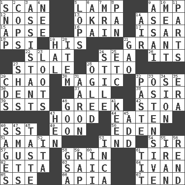 ACROSS 1. Examine hastily 5. Desk light 9. Electrical Unit 12. Sense of smell 13. Gumbo ingredient 14. Toward the sea 15. Domed church section 16. Ache 17. Austrian river, tributary to the Danube 18. 23rd letter of the Greek alphabet 19. Part of HMS, perhaps 21. Monetary aid 22. Narrow board 24. Ocean 26. ___ a Wonderful Life 27. Took without asking 28. "Beetle Bailey" pooch 29. US Secretary of Labor Elaine L. _ 30. Mysterious quality of enchantment 32. Airs 36. Gouge 37. Everything 38. SW Saudi Arabia district 39. Fast planes 40. Of Greece 42. Portico 43. Parka part 44. Consumed 46. Fast jet (abbr.) 49. A really long time 50. Locale of original sin 51. With great haste 53. Indiana (abbr.) 54. Title for a knight 57. Abrupt rush of wind 58. Broad smile 61. Hoop that covers a wheel 62. Singer James 63. Ketch in the Levant 64. _ the terrible 65. Compass dir. 66. Capital of Western Samoa 67. Be inclined (to) DOWN 1. Fastener 2. 911 reaches them 3. Aide 4. Born 5. Chops off 6. Alias (abbr.) 7. Medical imaging device (abbr.) 8. Baking dish 9. Slender Brazilian palm 10. Intended 11. Actors' quests 14. Wind 19. Actor Linden 20. A distinct part 21. E Mali city 23. Plunders 24. Vertical member of a panel or frame 25. And so on (abbr.) 27. "______ My Girl" (Turtles hit) 28. Stared 29. Music discs 31. Composer Copland 32. Thick mixture 33. Clearly or manifestly demonstrative 34. The Jewish people; Israel 35. Period 40. Thick or sticky substance 41. Peachy ____! 43. Layer 45. Increase 46. Gurus 47. Particles of soot 48. Clothes sense 52. Call ___ day 53. South American Indian 55. SW Asia republic 56. Tear apart 58. Girls' org. (abbr.) 59. Strike 60. One more than two 61. Teat (slang)
