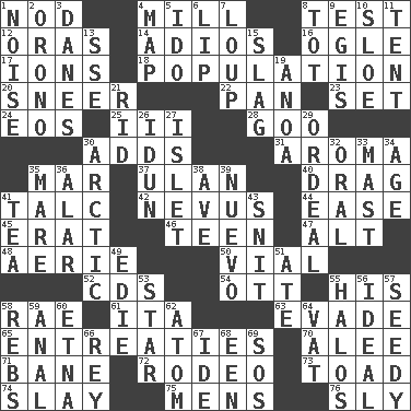 ACROSS 1. Lower and raise head in agreement 4. Place where flour is made 8. Trial 12. Mouths or openings 14. Goodbye (Sp.) 16. Stare at amorously 17. Charged particles 18. Census information 20. Contemptuous expression 22. Baking dish 23. Arrange properly for use 24. Greek goddess of the dawn 25. One more than two 28. Thick or sticky substance 30. Sums up 31. Scent 35. Spoil 37. ____ Bator, Mongolia 40. To trail on the ground 41. Baby powder 42. Congenital growth or mark on the skin 44. Comfort 45. Part of Q.E.F. 46. Adolescent 47. The first octave above the treble staff 48. Nest on high 50. Small bottle 52. Music discs 54. Baseball player Mel 55. Part of HMS, perhaps 58. Actress Charlotte 61. Call ___ day 63. Elude 65. Pleas 70. Toward shelter 71. Object of repulsion 72. Cowboy competition 73. Frog relative 74. Kill 75. Not women's 76. Mischievous DOWN 1. Annoying sound 2. U. of Maine site 3. Natives or inhabitants of Denmark 4. Atlas unit 5. Wedding promise 6. Mouth edge 7. Central Nebraska county 8. Small child 9. Armor plate that protects the chest 10. _ gin 11. Portable shelter 13. Compass dir. 15. Volcanic refuse 19. Small Philippine buffalo 21. To free from 26. Goddess of spring and wife of Bragi 27. Small island 29. Severe or trying experience 30. Northern region 32. Taken by mouth 33. Vertical spar for supporting sails 34. Personal question 35. Female horse 36. Having or resembling wings 38. "___ Maria" 39. New (sp.) 41. Beverage made from leaves 43. In a ____ (agitated or irritated) 49. Singer Brickell 51. Had dinner 53. Play the lead 55. Rings 56. Standard of perfection 57. Morally degraded 58. Confederate soldiers (slang) 59. Of or related to the anus 60. Inactive volcano in Sicily 62. Tiny particle 64. Large container 66. Marina Del _, California 67. Binary compound 68. Car or cant ending 69. Mayday