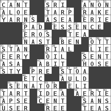 ACROSS 1. Patter 5. Indian title of respect (Mr.) 8. Soon (poet.) 12. Medicinal plant 13. Canvas cover 15. Immoral or dissolute person 16. Tall tales 18. At sea 19. One of the Great Lakes 20. Writing tablet 22. Core 24. Greek god of love 26. Afternoon social gathering 27. Political cartoonist Thomas 28. Benjamin's nick name 29. Baseball player Mel 32. Comedian Laurel of Laurel & Hardy 35. Monetary unit of Yemen 37. Untruth 38. Suggestive of the supernatural 39. Lubricate 40. Posted 41. White ___ sheet 42. "This won't hurt ____!" 43. Stockings 44. Filthy place 45. Before (prefix) 46. Portico 49. And so on (abbr.) 50. Old (Scot.) 51. Legislator 55. Connecticut Ivy Leaguer 56. Small pie 57. The main thing one is thinking about 59. Nest on high 63. Domed church section 64. Penny 65. Without 66. One who makes use of a thing 67. To riddle 68. Beverages made from leaves DOWN 1. Island 2. Wing 3. Or not 4. 3-inch nail 5. R.R. building 6. Raze (variant) 7. Angers 8. Sports stadium 9. Drug cop 10. Migrant worker of the '30s 11. Born 14. Soft color 17. "Two Mules for Sister ____" 21. Two (Sp.) 23. Car or cant ending 25. Disco prop 28. Greek mezzo-soprano Agnes 29. Butter sub 30. Airtight sealed metal containers 31. Wig 32. Oceans 33. Trial 34. Like ___ of sunshine 36. One more than two 40. Most dubious of character or honesty 42. Northern region 45. Parent Teacher Assoc. 47. Third day of the wk. 48. Water jar 49. Keyboard key 51. Plant excrements 52. Celtic language 53. River in Europe 54. French philosopher Descartes 56. The 19th letter of the Greek alphabet 58. Had dinner 60. Actress Charlotte 61. _ tizzy (2 wds.) 62. Curvy letter