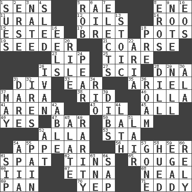 ACROSS 1. Elected reps. 5. Actress Charlotte 8. Compass dir. 11. Mountain range 12. Lubricates 14. Friend of Pooh 15. First name in cosmetics 17. Cy Young winner Saberhagen 18. Plant holders 19. Sowing specialist 21. Unrefined 23. Mouth edge 25. Hoop that covers a wheel 26. Small island 27. _-fi 28. Heredity factor (abbr.) 31. HTML Container Element 33. Ewer handle 35. Satellite of Uranus 37. Hindu Mythology: god of death 38. To free from 40. Spanish pot 41. Sports stadium 43. Petroleum 45. 100% 46. Consenting reply 47. Tavern 50. Lip ointment 52. Silent film actress Nazimova 53. R.R. building 54. Seem 56. Having greater elevation 61. Petty quarrel 62. Canisters 65. Makeup applied to the cheeks 66. One more than two 67. Inactive volcano in Sicily 68. Be tempered by heat 69. Baking dish 70. Slangy assent 71. Whirlpool DOWN 1. Takes to court 2. Celtic language 3. Nathan's nickname 4. Downhill vehicle 5. Director Reiner 6. Atmosphere 7. Opts 8. Greek god of love 9. Make mention of 10. Greek goddess of the dawn 13. Unemotional 16. Snakelike fish 18. Before (prefix) 20. Cause heat under the collar 22. Operatic vocal solo 24. Lightbulb-shaped fruit 26. "Terrible" tsar 28. Deli pickle 29. 1994 drama film starring Jodie Foster 30. According to 31. Have the gumption 32. Angers 34. River (Sp.) 36. Wander aimlessly 37. Can I? 39. Claim 42. Competent 44. Thin strip of wood or metal 48. Having winglike extensions 49. Noteworthy scarcity 51. Den 52. Fitting 54. Capital of Western Samoa 55. Ache 57. Went 58. Became colored 59. Mild oath 60. Trust 61. Small drink 63. Compass dir. 64. Plant excrement
