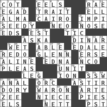 ACROSS 1. Small bed 4. Snakelike fish 8. Actress Charlotte 11. Mild oath 13. Distinguishing feature 15. Pipe bend 16. _ mater 17. Capital of Egypt 18. Body of Kaffir warriors 19. Morally degraded 21. Modern: prefix 22. Olfactory organ 23. Begley and Asner 24. Eastern Standard Time (abbr.) 27. Nervous spasm 29. "____ silly question..." 30. Middle Eastern gold or silver currency 34. Soggy 36. Competent 39. Peak District village in England 40. Redecorate 41. American astronaut and politician John 43. Celtic language 44. Place in a line 46. Pulitzer Prize-winning author Ferber 47. Non-commissioned officer (abbr.) 48. Entreaties 49. A single undivided whole 51. Part of a journey 53. Electrically charged atom 54. Compass dir. 57. Of or related to the anus 60. The grampus (Milton) 63. Having gotten out of bed 65. Small, narrow, flatbottom fishing boat 66. Make _____ (do battle with) 69. Johnson of "Laugh-In" 70. Last letter of the English alphabet 71. Sibling's daughter 72. Sliced desserts 73. Raised railways 74. Remaining after all deductions 75. Pacific Standard Time (abbr.) DOWN 1. Desist 2. Stared at amorously 3. Softens 4. And so on (abbr.) 5. Epoch 6. (Had) reclined 7. Father 8. San ____ (Riviera town) 9. High mountains 10. Writer Wiesel 12. Male parent 14. A blast of a horn 18. Event 20. Affirmative reply 25. Heroin 26. Eating place 28. Binary compound 29. Without tonality 31. Drug cop 32. In addition 33. To separate or throw off 34. Water source 35. Singer Brickell 37. Directed 38. World-weariness 40. Strike 42. Billionth: prefix 45. Compass dir. 50. _ tizzy (2 wds.) 52. Bride's dress 54. Remove all contents or possession from 55. Locates 56. Obtain by seizing forcibly or violently 57. Axlike tool, used for shaping wood 58. Christmas carol 59. Ancient Greek god of war 61. Precipitation 62. Algonquian 64. Plant excrement 67. Sep. follower 68. Fish or hair follower