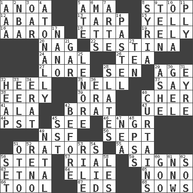 ACROSS 1. Small Philippine buffalo 5. Nanny (var.) 8. Constrict 12. Blind as ____ 13. Canvas cover 15. Shout 16. Composer Copland 18. Singer James 19. Have confidence or faith in 20. Tired old horse 22. French poetic form 24. Of or related to the anus 26. Beverage made from leaves 27. Old wives' tales, e.g. 28. Elected rep. 29. Grow older 32. Person who is morally reprehensible 35. 1994 drama film starring Jodie Foster 37. Declare 38. Suggestive of the supernatural 39. Mouth or opening 40. "Mermaids" star 41. In the manner of 42. Naughty child 43. Ubangi River tributary 44. Pacific Standard Time (abbr.) 45. Observe 46. Engineer (abbr.) 49. Overdraft (abbr.) 50. Back-to-school mo. 51. Speakers 55. White ___ sheet 56. Proofreading order 57. Monetary unit of Yemen 59. Omens 63. Inactive volcano in Sicily 64. Writer Wiesel 65. Words to Nanette 66. Instrument 67. Begley and Asner 68. Sty mamas DOWN 1. American Automobile Association (abbr.) 2. Basketball assoc. 3. Rowing implement 4. Lacking a tonal center or key 5. Had dinner 6. Floor coverings 7. Johnson of "Laugh-In" 8. Damascus' land 9. Adolescent 10. Spanish pot 11. Strand of rope, yarn or thread 14. Soft color 17. Billionth: prefix 21. Slender fish 23. Nine, plus one 25. Poe poem 28. Chalkboards 29. American tennis player Robert 30. Highlander 31. Jane of fiction 32. Pile 33. Snakelike fish 34. Part of Q.E.F. 36. Epoch 40. Window treatments 42. Prior to 45. Fast jet (abbr.) 47. Teachers' org. 48. Global Positioning Systems (abbr.) 49. Relating to or accompanying birth 51. "Beetle Bailey" pooch 52. Former U.S. Attorney General Janet 53. Cause heat under the collar 54. Alleged 56. Arrange properly for use 58. French article 60. Thick or sticky substance 61. Compass dir. 62. Distress signal