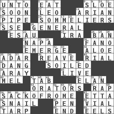 ACROSS 1. To (old English) 5. Erode 8. _ gin 12. Within a short period 13. Lion 14. Believer in; advocate of (suffix) 15. Corncob 16. Wine waiters 19. Compass dir. 20. Commissioned military rank 21. He sold his birthright 23. Lyricist Gershwin 24. Prohibit 27. California wine valley 30. Papal veil 31. Develop 34. Medicinal plant 35. The sixth month of the Jewish calendar 38. Rob, plunder, or pillage 40. Monetary unit of Yemen 41. Mild oath, euphamism for damn 42. Dirtied 44. Like ___ of sunshine 45. Not recorded 46. Cartoonist voice _ Blanc 47. Bar bill 50. Enthusiasm 53. Speakers 57. Strike 59. Italian handbag shop? 63. Singer James 64. Slow-paced one 65. Animal enclosure 66. Small bottle 67. Canvas cover 68. Conclusion 69. Snakelike fish DOWN 1. United States Postal Service (abbr.) 2. Annoying sound 3. Drinks excessively 4. Single 5. Otherwise 6. Age 7. Heavy book 8. _ Lanka 9. Untruth 10. Rowing implement 11. Followers of ems 14. Silent film actress Nazimova 17. Medical imaging device (abbr.) 18. Ewer handle 20. Island territory of the United States 22. Disorder of the immune system 24. Indonesian resort city 25. Small Philippine buffalo 26. Christmas carol 28. For each 29. Ancient Greek god of war 30. Bundle 32. E Mali city 33. Tending to cause great harm 35. First man 36. Have the gumption 37. Of or related to the anus 39. Connecticut Ivy Leaguer 43. Nights before holidays 47. Utensil 48. Sandy's bark 49. Soap unit 51. Nick name for Arthur 52. Relating to or accompanying birth 54. Drink excessively 55. Sign of something about to happen 56. Tear apart 58. Friends 59. Fast jet (abbr.) 60. Santa ___, CA 61. Automobile 62. Sleep 63. First lady