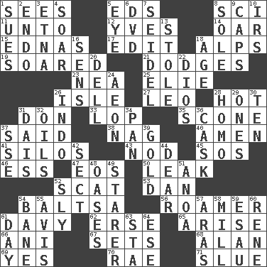 ACROSS 1. Perceives with the eye 5. Begley and Asner 8. _-fi 11. To (old English) 12. Jacques Cousteau's middle name 14. Boat paddle 15. Ferber et al. 17. Prepare for publication 18. High mountains 19. Flew 21. Evades 23. Teachers' org. 25. Writer Wiesel 26. Capri or Wright 27. Lion 28. Being at a high temperature 31. Spanish title 33. Chop off 35. Biscuitlike quick bread 37. Expressed in words 38. Tired old horse 40. So be it 41. Grain storage towers 43. Dreamland 45. Distress signal 46. Double-curved letter 47. Greek goddess of the dawn 50. Path through which fluid escapes 52. Scram, to a cat 53. Daniel's nick name 54. Greek mezzo-soprano Agnes 56. Nomad 61. American folk hero Crockett 62. Celtic language 65. Get up 66. Cuckoo 67. Arranges properly for use 68. ____ Jay Lerner 69. Affirmative reply 70. Actress Charlotte 71. Turn sharply DOWN 1. Takes to court 2. Inside; within (prefix) 3. Inactive volcano in Sicily 4. Fly high 5. Sight organ 6. Movie disc 7. A glass for beer 8. Flatfish 9. Smile enhancers 10. Big collection agency 13. Fur scarf 16. Elected reps. 18. Ripen 20. Small valley 22. "Vaya con ____" 24. A really long time 26. _ china 28. Same (prefix) 29. Washington bills 30. "___ Little Indians" 31. Raised platform 32. Lubricates 34. Baking dish 36. Keg 37. Compass dir. 39. Gilded 42. Religious group 44. Letter starter 48. Fertile tracts in a desert 49. A viewer who gazes fixedly 51. Small Philippine buffalo 52. Roguish 54. Object of repulsion 55. Advice 57. Ancient river in northeast Turkey 58. Place where flour is made 59. He sold his birthright 60. French philosopher Descartes 61. 24 hours 63. R.R. building 64. Compass dir.