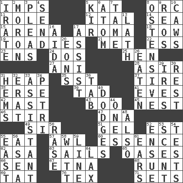 ACROSS 1. Naughty children 5. Krazy ___ of comics 8. The grampus (Milton) 11. Hero or heavy, e.g. 12. Slanted text style (abbr.) 14. Ocean 15. Sports stadium 17. Scent 18. Pull behind 19. Sycophants 21. Was introduced to 22. Curvy letter 23. Followers of ems 24. Two (Sp.) 25. Layer 27. Black tropical American cuckoo 28. SW Saudi Arabia district 31. Pile 35. Fast jet (abbr.) 37. Become fatigued 38. Celtic language 39. Bit 41. Nights before holidays 42. Vertical spar for supporting sails 43. Oct. 31 cry 45. A home for chicks 46. Commotion 47. Heredity factor (abbr.) 49. Title for a knight 51. Set 52. Eastern Standard Time (abbr.) 55. Ingest 57. Leather borer 60. Core 62. White ___ sheet 63. Travel by water 65. Fertile tracts in a desert 66. Elected rep. 67. Inactive volcano in Sicily 68. The smallest animal of a litter 69. Make lace 70. John Ritter's dad 71. Arranges properly for use DOWN 1. Feeling or showing extreme anger 2. Person of subnormal intelligence 3. Entreaties 4. Post 5. Apertif with cassis 6. Tiny particle 7. Not wild 8. Clearly or manifestly demonstrative 9. Vintage cars 10. Crow sounds 13. Thin strip of wood or metal 16. Opera by Verdi 17. Help 20. Immeasurably long periods of time 26. Eroded 29. Angers 30. State of inaction 31. Equivocates 32. Part of Q.E.F. 33. Aide 34. _ dish (used to culture cells) 36. Bar bill 40. Evades 44. Singles 48. In addition 50. To erase 52. Follow as a consequence or result 53. Aroma 54. Trials 55. Compass direction 56. At sea 58. Electrical Unit 59. Actor's bit 61. Hearing organs 64. Not strict