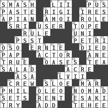 ACROSS 1. Box-office sellout 6. Cards in a Roman deck? 9. Festering 12. Thick mixture 13. Swiss mountan, "Queen of the Mountains" 14. Angers 15. Bee-related 16. Mine, in Marseilles 17. Hero or heavy, e.g. 18. _ Lanka 19. One who makes use of a thing 20. Drink excessively 21. Court order 23. Corn or form start 24. Inconspicuous attention getter 25. _ dish (used to culture cells) 28. Bear (Spanish) 30. Bert's buddy 34. Passed on 35. Infant food 36. Thespian 38. One (Scot) 39. Loyal 41. Fertile tracts in a desert 43. Beverage made from leaves 44. Vegetable dish 46. Land measure 48. White ___ sheet 49. 57 in ancient Rome 50. Group working together 51. A type of plum 53. Spoil 56. Silvers or Donahue 57. Margarine 58. Wanderer 60. Arranges properly for use 61. Monthly bill 62. 1973 Nobel Price Winner (Physics) Leo 63. Attempt 64. Say or write further 65. Giggle DOWN 1. Health resort 2. Atlas contents 3. SW Saudi Arabia district 4. Flight of steps 5. Layer 6. Welles in "The Third Man" 7. Composer Stravinsky 8. One more than two 9. Conciliate 10. Ubangi River tributary 11. Compass dir. 13. To erase 14. Pressed 19. Extreme 20. Uncastrated adult male sheep 22. Purpose 24. Teen's desire 26. French philosopher Descartes 27. The main thing one is thinking about 28. Chooses 29. "Two Mules for Sister ____" 31. Non-commissioned officer (abbr.) 32. Call ___ day 33. Greek goddess of the dawn 37. Break or tear apart 40. Artist's stands 42. _-fi 45. Obsolete 47. Full of chinks, cracks, or crevices 49. Plunder 50. "Mermaids" star 51. Downhill vehicle 52. Grant temporary use of 54. Nursemaid 55. Libertine 56. Pacific Standard Time (abbr.) 57. Mouth or opening 58. Fish or hair follower 59. Pass on
