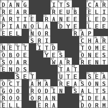 ACROSS 1. Mild oath, euphamism for damn 5. It is 8. Automobile 11. Rump 12. Reuben's nickname 14. Connecticut Ivy Leaguer 15. Nick name for Arthur 17. The wife of a rajah (variant) 18. Directed 19. Player piano 21. Color 22. Area sheltered from the wind 23. Snakelike fish 24. Not either 25. Hit sharply and swiftly 27. _ Lanka 28. Burn to charcoal 31. Remaining after all deductions 35. It would 37. Heavy book 38. Mitch Miller's instrument 39. Consenting reply 41. Singles 42. Fly high 43. Armed conflict 45. Monthly bill 46. Extremities 47. Make lace 49. Put into a specified state 51. Shoshoni 52. Ocean 55. Sep. follower 57. Nanny (var.) 60. Thinks logically 62. Thick or sticky substance 63. "The Thinker" sculptor 65. Table seasonings 66. Friend of Pooh 67. Northwest Algerian city 68. The content of cognition 69. Pipe bend 70. Period 71. Dormintory (informal) DOWN 1. Window treatment 2. Nest on high 3. Relating to or accompanying birth 4. Amused look 5. Lyricist Gershwin 6. Look after 7. Chop _ 8. Portable communications device 9. Toward shelter 10. Travel on or in a vehicle 13. Fermented drink made from hops 16. Immeasurably long periods of time 17. Noteworthy scarcity 20. Australian parrot (variant) 26. Thespian 29. So be it 30. Respite 31. Olfactory organ 32. Inky black, to poets 33. Inedible or poisonous agaric 34. Laconic 36. Morning condensation 40. Titan orbits this 44. Assign a rank or rating to 48. Beverages made from leaves 50. Pacific island yam 52. Twentieth part of a lira 53. Keyboard key 54. Indian state 55. Legendary monster 56. Calm and collected 58. Greater amount 59. The sixth month of the Jewish calendar 61. Alleged 64. _ tizzy (2 wds.)