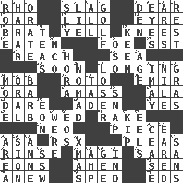 ACROSS 1. 17th letter of the Greek alphabet 4. Volcanic refuse 8. Letter starter 12. Boat paddle 13. _ and Stitch 14. Jane of fiction 15. Naughty child 17. Shout 18. Leg joints 19. Consumed 21. Enemy 23. Fast jet (abbr.) 24. Arrive at 26. Ocean 28. Within a short period 30. Yearning 34. Crowd into 37. Printing process, for short 39. Arab leader 40. Mouth or opening 41. Collect or gather 43. Chicken ___ king 44. Have the gumption 46. An important port of Yemen 47. Consenting reply 48. Shoved, as through a crowd 51. Immoral or dissolute person 54. Modern: prefix 55. Component 58. White ___ sheet 61. Acura sports coupe 63. Entreaties 65. Wash lightly 67. Wise men 71. "Two Mules for Sister ____" 72. Immeasurably long periods of time 73. So be it 74. Elected rep. 75. Afresh 76. Drove too fast 77. Begley and Asner DOWN 1. Loose flowing garment 2. Ethiopian city, capital of Harari 3. Declaim 4. Secret 5. Falsehood 6. Everything 7. _ course 8. Lair 9. Sight organs 10. Ancient Greek god of war 11. Remainder 16. Afternoon social gatherings 18. Peachy ____! 20. Non-commissioned officer (abbr.) 22. Bear (Spanish) 25. Israeli folk dance 27. Ripen 29. Roamer 30. Failure 31. "If ____ say so..." 32. The longest river in the world 33. Pate de foie ____ 34. Method 35. Of the mouth 36. Sharp remark 38. Small boy 42. Fastener 45. A really long time 49. We are 50. Greek goddess of the dawn 52. Monetary unit of Laos 53. Snakelike fish 56. Desist 57. Having ears or earlike features 58. Length times width 59. The Jewish people; Israel 60. Singer Murray 62. Dec. holiday 64. Without 66. Compass dir. 68. Electrical Unit 69. Unit of force equal to gravity 70. Indiana (abbr.)
