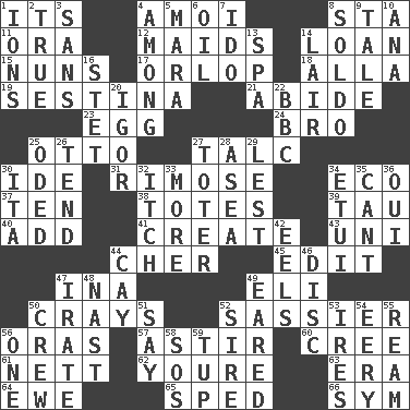 ACROSS 1. It is 4. Mine, in Marseilles 8. R.R. building 11. Mouth or opening 12. Women servants 14. Grant temporary use of 15. Religious women 17. Lowest deck of a ship 18. Silent film actress Nazimova 19. French poetic form 21. Remain 23. Ovum 24. Sis' sibling 25. "Beetle Bailey" pooch 27. Baby powder 30. Binary compound 31. Full of chinks, cracks, or crevices 34. Environmental prefix 37. Nine, plus one 38. Lugs 39. The 19th letter of the Greek alphabet 40. Increase 41. Make 43. Corn or form start 44. "Mermaids" star 45. Prepare for publication 47. _ tizzy (2 wds.) 49. Connecticut Ivy Leaguer 50. Trading vessels 52. More lively and spirited 56. Mouths or openings 57. Having gotten out of bed 60. Algonquian 61. Remaining after all deductions 62. You are 63. Epoch 64. She-sheep 65. Broke a traffic law 66. Symbol (abbr.) DOWN 1. Charged particles 2. Loyal 3. Without 4. Amid 5. Hindu Mythology: god of death 6. Petroleum 7. Wedding promise 8. Twentieth part of a lira 9. Falsehood 10. Santa ___, CA 13. Health resort 14. Den 16. Proofreading order 20. Composer Stravinsky 22. English channel? 25. Wrote a lyric poem 26. Watch over 27. Carrier 28. At sea 29. For fear that 30. Call ___ day 32. Hankering 33. Greater amount 34. Needle holder 35. Patter 36. Fr. "Yes" 42. Snakelike fish 44. Island 46. Compact _ 47. Feeling or showing extreme anger 48. Political cartoonist Thomas 49. Having ears or earlike features 50. Group working together 51. Declare 52. Father 53. Angers 54. Suggestive of the supernatural 55. 480, 500 or 516 sheets of paper 56. Single 58. Mayday 59. Uncastrated adult male sheep