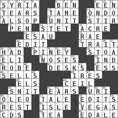 ACROSS 1. Damascus' land 6. Benjamin's nick name 9. Car or cant ending 12. Rends 13. Docile 14. Southwest Nigerian state 15. Columnist Joseph or Stewart 16. A single undivided whole 17. Commotion 18. Writing instrument 19. Proofreading order 20. Measure of real estate 21. Son of Isaac 23. Actress Charlotte 24. Prepare for publication 25. Distinguishing feature 28. Possessed 30. Abounding in pines 34. Portico 35. Connecticut Ivy Leaguer 36. Olfactory organs 38. Indiana (abbr.) 39. Loose flowing garment 41. Writing tables 43. Curvy letter 44. Makes a sale 46. Angers 48. Raised railways 49. To provide with a ceiling 50. In a ____ (agitated or irritated) 51. Hearing organs 53. RI univ. 56. Margarine 57. Falsehood 58. Proofreads 60. Relief 61. Small island 62. Viva Las _ 63. Music discs 64. Beverage made from leaves 65. Peak District village in England DOWN 1. R.R. building 2. Sharp bark 3. Raze (variant) 4. Pressed 5. Viper 6. Object of repulsion 7. Give off 8. Fish or hair follower 9. Pleas 10. Singer Brickell 11. Not either 13. Ballerina skirt 14. Motion picture awards 19. Smooth fabric 20. Nonscientific branch of learning 22. Small drink 24. The property of being fit to eat 26. Charged particles 27. Bits 28. Possessive pronoun 29. Medicinal plant 31. Allow head to fall sleepily 32. Compass dir. 33. It is so 37. Atmospheres 40. American author Paul (1891-1958) 42. _ Lanka 45. Fast jet (abbr.) 47. Evaded 49. Algonquian 50. Downhill vehicle 51. Relaxation 52. Silent film actress Nazimova 54. Port city in Latvia 55. Slanted text style (abbr.) 56. The grampus (Milton) 57. Teat (slang) 58. First lady 59. Compass dir.