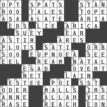 ACROSS 1. Choose 4. Arguments over trivial matters 9. Comedian Laurel of Laurel & Hardy 13. Friend of Pooh 14. Falsehoods 15. Drink excessively 16. White ___ sheet 17. Having winglike extensions 18. Operatic vocal solo 19. Begley and Asner 21. Whopper 22. N. Chile seaport 24. Chop _ 26. Hearing organ 27. Moving about 29. Ancient Greek god of war 30. Ground plans 31. Suttee (variant) 33. Globe 36. "Barney Miller" actor Jack 37. Normal relaxed breathing 40. Perceive with the eye 41. Snakelike fish 42. 480, 500 or 516 sheets of paper 43. Brizilian seaport 45. Mild oath 47. Unconcealed 48. Fish or hair follower 49. (Had) reclined 50. First name in cosmetics 52. Luau course 54. Fast jet (abbr.) 56. Baltic tributary 57. Shopping centers 59. Big collection agency 61. Singer Murray 62. Assad's deity 63. Compete 64. Raze (variant) 65. Arrive at 66. Period of immesurable duration DOWN 1. Mouth or opening 2. Introduce or present, as a question 3. Inedible or poisonous agaric 4. R.R. building 5. Friendly 6. Mountain range southwest of Kyrgyzstan 7. False hair 8. Compass dir. 9. Flight of steps 10. Torque (variant) 11. Capital of Western Samoa 12. Teachers' org. 20. Set or collection 22. Nest on high 23. Actress Charlotte 25. Celtic language 27. Domed church section 28. _ gin 29. Tiny particle 31. Moved rapidly 32. Santa ___, CA 33. Clearly or manifestly demonstrative 34. Tail end 35. Waist strap 38. A salt of uric acid 39. Small Philippine buffalo 44. Advice 45. Main course 46. Turn to the right 49. Pale purple color 50. Pulitzer Prize-winning author Ferber 51. Elected reps. 52. Light colored 53. Water jar 55. Musical group of three 56. Boat paddle 57. Make imperfect 58. Quiet! 60. Elected rep.