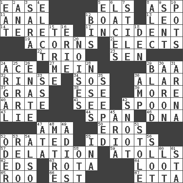ACROSS 1. Relaxation 5. Raised railways 8. Viper 11. Of or related to the anus 12. Water vessel 13. Lion 14. Cylindrical with tapered ends 17. Happening 19. Oak nuts 21. Chooses 22. Musical group of three 23. Elected rep. 24. Adept person 27. Chow _ 29. Sound made by sheep 32. Remove soap 34. Mayday 36. Having or resembling wings 37. Pate de foie ____ 38. Compass dir. 39. Greater amount 40. Johnson of "Laugh-In" 41. Perceive with the eye 42. Soup utensil 43. Whopper 44. Connect, as a bridge 46. Heredity factor (abbr.) 47. Housemaid (var.) 50. Greek god of love 52. Declaimed 55. Foolish or stupid persons 57. Conveyance 59. Ringlike coral islands and reefs 62. Begley and Asner 63. Round or rotation of duties 64. Plunder 65. Friend of Pooh 66. Eastern Standard Time (abbr.) 67. Singer James DOWN 1. Consume 2. A saturated hydrocarbon 3. "Two Mules for Sister ____" 4. Voters do this 5. A really long time 6. Shoestrings 7. Vertical member of a panel or frame 8. Actor Baldwin 9. Emitted 10. Plant holders 12. Again 15. Singer Mel 16. One of the Great Lakes 18. Lair 20. Annoying sounds 24. Therefore, facetiously 25. High-altitude cloud 26. Maternal 28. Olfactory organs 29. Vital fluid 30. Composer Copland 31. Sports stadium 33. Compass dir. 35. Oozed 36. Electrical Unit 42. Snob 45. Operatic vocal solo 47. "One Day ___ Time" 48. Distance measurement (Brit.) 49. Goodbye (Sp.) 51. Fur scarf 52. River in Europe 53. Make new 54. In addition 55. _ tizzy (2 wds.) 56. Notch 58. Baseball player Mel 60. Car dealer's back yard 61. R.R. building