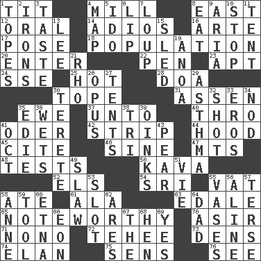 ACROSS 1. Teat (slang) 4. Place where flour is made 8. 90 degrees 12. Relating to the mouth 14. Goodbye (Sp.) 16. Johnson of "Laugh-In" 17. Introduce or present, as a question 18. Census information 20. Keyboard key 22. Fenced enclosure 23. Fitting 24. Compass dir. 25. Being at a high temperature 28. ___ good deed 30. Drink excessively 31. NE Netherlands city 35. She-sheep 37. To (old English) 40. Through, poetically 41. Baltic tributary 42. Empty completely 44. Parka part 45. Quote 46. Trig term 47. Mountains (abbr.) 48. Trials 50. Polynesian shrub of the pepper family 52. Raised railways 54. Indian title of respect (Mr.) 55. Large container 58. Had dinner 61. According to 63. Peak District village in England 65. Music shop? 70. SW Saudi Arabia district 71. Words to Nanette 72. Giggle 73. Lairs 74. Liveliness 75. Elected reps. 76. Observe DOWN 1. Drinks excessively 2. Removes the wrinkles 3. Clothes sense 4. Atlas unit 5. Wedding promise 6. Mouth edge 7. Central Nebraska county 8. Ingest 9. Operatic vocal solo 10. Cease 11. Portable shelter 13. Area sheltered from the wind 15. Downhill vehicle 19. Small Philippine buffalo 21. 17th letter of the Greek alphabet 26. Musical composition 27. Portable shelters 29. Respiratory problem 30. Cigar-shaped 32. Opportunity 33. Greek god of love 34. Lower and raise head in agreement 35. Singer Brickell 36. Soaks 38. Three (prefix) 39. Pig sounds 41. Sep. follower 43. Lightbulb-shaped fruit 49. Cole _ (cabbage dish) 51. Compete 53. Narrow, elongated depression 55. Flower holders 56. Place in a line 57. Laconic 58. Singer Murray 59. Implement 60. Inactive volcano in Sicily 62. Ancient Greek god of war 64. Male parent 66. Age 67. Definite Article 68. Layer 69. Consenting reply