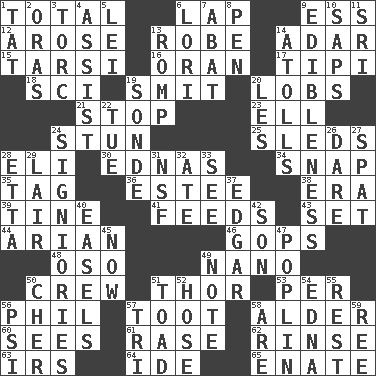 ACROSS 1. "_____ Recall" 6. Pet locale 9. Double-curved letter 12. Came up 13. Loose flowing garment 14. The sixth month of the Jewish calendar 15. Tarsus (plural) 16. NW Algerian seaport 17. Native american tent (variation) 18. _-fi 19. Stricken, poetically 20. Tennis shots 21. Close up, plug up 23. Pipe bend 24. Surprise greatly 25. Bobsleighs 28. Biblical high priest 30. Ferber et al. 34. Fastener 35. Label 36. First name in cosmetics 38. Period 39. Prong on a fork 41. Eats 43. Arrange properly for use 44. Believer in; advocate of (suffix) 46. Republicans 48. Bear (Spanish) 49. Billionth: prefix 50. Ship's personnel 51. Son of Odin 53. For each 56. Silvers or Donahue 57. A blast of a horn 58. Tree or shrub in the Birch family 60. Observes 61. To erase 62. Wash lightly 63. Big collection agency 64. Binary compound 65. Maternal DOWN 1. Make lace 2. Mouths or openings 3. Torque (variant) 4. Aid 5. Flowery wreath 6. Australian parrot (variant) 7. Blind as ____ 8. Animal enclosure 9. The property of being fit to eat 10. Plant excrements 11. _ Lanka 13. Play 14. Ringlike coral islands and reefs 19. Message 20. French article 22. Third day of the wk. 24. Seigniories (variant) 26. Have the gumption 27. Petty quarrel 28. Singer James 29. Den 31. Overdraft (abbr.) 32. Had dinner 33. Observe 37. _ Allan Poe 40. Artist's stands 42. Manchild 45. At this time 47. Cotton for raincoats, e.g. 49. Short letter 50. "Mermaids" star 51. Frog relative 52. Flexible conduit 54. Pulitzer Prize-winning author Ferber 55. Relief 56. Air pressure measure (abbr.) 57. Three (prefix) 58. "We ___ not amused" (Victoria) 59. To sift