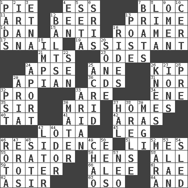 ACROSS 1. Sliced dessert 4. Curvy letter 7. Coalition 11. Tate display 12. Fermented drink made from hops 13. A-one 14. One of the 12 tribes of Israel 15. Against 16. Wanderer 17. Slow-paced one 19. Helper 21. Mountains (abbr.) 23. Lyric poems 24. Domed church section 25. A saturated hydrocarbon 26. Monetary unit of Laos 29. Bee-related 30. Music discs 31. Or not 32. Adept person 33. "We ___ not amused" (Victoria) 34. Compass dir. 35. Title for a knight 36. Medical imaging device (abbr.) 37. Residences 40. Make lace 41. Assist 42. Ancient river in northeast Turkey 43. Globular water bottle used in Asia 45. Part of a journey 46. Dwelling 51. Citrus fruits 55. Speaker 56. Coop moms 58. Everything 59. Carrier 60. Toward shelter 61. Actress Charlotte 62. SW Saudi Arabia district 63. Bear (Spanish) 64. Plus DOWN 1. Groovy apts. 2. SW Asia republic 3. Inactive volcano in Sicily 4. Car or cant ending 5. Bristle 6. Indian titles of respect 7. Naughty children 8. Pale green bean 9. Sign of things to come 10. Sure thing 12. Greek mezzo-soprano Agnes 13. Airs 16. Amusement-park features 18. Body of Kaffir warriors 20. Something which is sent 22. Elected rep. 24. To the left, to Queeg 25. Bitter 26. Leg joints 27. Charged atoms 28. Before (prefix) 29. Roberta Peters solo 32. Pacific Standard Time (abbr.) 33. Believer in; advocate of (suffix) 36. Mother 37. Actor Linden 38. Threatening words 39. Wise men 43. 61 cubic inches 44. Scent 46. Round or rotation of duties 47. Greek god of love 48. Suttee (variant) 49. US Secretary of Labor Elaine L. _ 50. Snakelike fish 52. Hindu Mythology: god of death 53. Style 54. Downhill vehicle 57. Modern: prefix