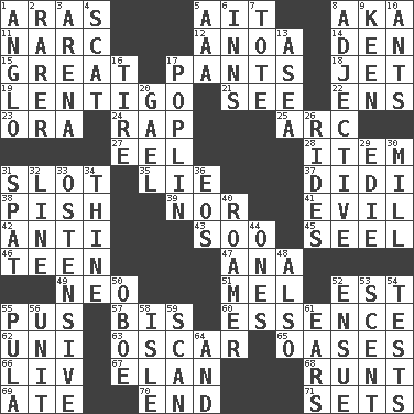 ACROSS 1. Caspian sea tributary 5. Small island 8. Alias (abbr.) 11. Drug cop 12. Small Philippine buffalo 14. Lair 15. Relatively large 17. Leg coverings 18. Type of plane 19. Small, flat, pigmented spot on the skin 21. Observe 22. Followers of ems 23. Mouth or opening 24. Reproach for some lapse or misdeed 25. Curve 27. Snakelike fish 28. A distinct part 31. Notch 35. Falsehood 37. "You Light Up My Life" star Conn 38. Expression of disdain 39. Or not 41. Morally bad or wrong 42. Against 43. "Barney Miller" actor Jack 45. Sew up the eyelids of hawks and falcons 46. Adolescent 47. Santa ___, CA 49. Modern: prefix 51. Cartoonist voice _ Blanc 52. Eastern Standard Time (abbr.) 55. Tenth month of the Hindu calendar 57. Again 60. Center 62. University (slang) 63. Motion picture award 65. Fertile tracts in a desert 66. 54 in ancient Rome 67. Enthusiasm 68. The smallest animal of a litter 69. Had dinner 70. Conclusion 71. Puts into a specified state DOWN 1. White American of non-Hispanic descent 2. More uncommon 3. Sports stadium 4. Scram! 5. American Automobile Association (abbr.) 6. Restaurants 7. Lug 8. Descriptive word 9. Peachy ____! 10. Pismires 13. Toward the sea 16. Hoop that covers a wheel 17. Cotton for raincoats, e.g. 20. Highlander 26. Amusement-park features 29. Singer Brickell 30. Place where flour is made 31. Petty quarrel 32. Actor's bit 33. Clearly or manifestly demonstrative 34. One or ones belonging to thee 36. Greek goddess of the dawn 40. Nomad 44. Washington bills 48. In addition 50. Mitch Miller's instrument 52. Take place subsequently 53. Odor 54. Trials 55. Monetary unit of Botswana 56. A single undivided whole 58. Small island 59. Examine minutely or intensely 61. Hearing organs 64. Also