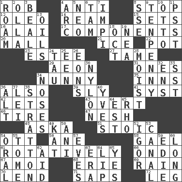 ACROSS 1. Director Reiner 4. Opposed to 8. Cease 12. Margarine 14. 480, 500 or 516 sheets of paper 15. Arranges properly for use 16. Mountain range southwest of Kyrgyzstan 17. Pieces 20. Promenade 21. Frozen water 22. Cooking vessel 23. First name in cosmetics 27. Docile 29. Period of immesurable duration 31. Washington bills 34. Pet term 35. Taverns 36. In addition 39. Mischievous 41. System (abbr.) 42. Allows 43. Unconcealed 46. Become fatigued 47. Soft 48. "____ silly question..." 51. Unemotional 54. Baseball player Mel 56. A saturated hydrocarbon 58. Highlander 61. Rotating or pertaining to rotation 66. Southwest Nigerian state 67. Mine, in Marseilles 68. One of the Great Lakes 69. Precipitation 70. Grant temporary use of 71. Plant excrements 72. Part of a journey DOWN 1. Wander 2. Spanish pot 3. Memphis, Tenn. Street 4. Curve 5. Modern: prefix 6. Scottish cap 7. Body of Kaffir warriors 8. Compass dir. 9. 3-inch nail 10. "Beetle Bailey" pooch 11. Inconspicuous attention getter 13. Petroleums 18. Sep. follower 19. Teachers' org. 24. The 19th letter of the Greek alphabet 25. Car or cant ending 26. Immeasurably long periods of time 28. Damp 30. Thermoplastic polyamide 32. Followers of ems 33. Fast jet (abbr.) 34. Olfactory organs 36. The first octave above the treble staff 37. Luau accessory 38. Ski resort town in Vermont 40. Jacques Cousteau's middle name 44. Eastern Standard Time (abbr.) 45. 17th letter of the Greek alphabet 49. Krazy ___ of comics 50. Cuckoo 52. Russian composer Stravinsky 53. Lessep's creation 54. Spoken 55. Heavy book 57. Nights before holidays 59. Singer Brickell 60. Protracted 62. Help 63. Epoch 64. Mouth edge 65. Affirmative reply