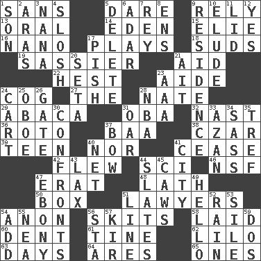 ACROSS 1. Without 5. Have the gumption 9. Depend 13. Relating to the mouth 14. Genesis locale 15. Writer Wiesel 16. Billionth: prefix 17. Romps 18. Beer foam 19. More lively and spirited 21. Assist 22. Behest 23. Helper 24. Gear tooth 27. Definite Article 28. Nathan's nickname 29. Phillipine bananalike plant 31. Chief or king in Benin or Nigeria 32. Political cartoonist Thomas 36. Printing process, for short 37. Sound made by sheep 38. Russian ruler of old 39. Adolescent 40. Or not 41. Stop 42. Soared 44. _-fi 46. Overdraft (abbr.) 47. Part of Q.E.F. 48. Thin strip of wood or metal 50. Gift holder 51. Those who practice law 54. Soon (poet.) 56. Burlesque acts 58. Put down 60. Scratch 61. Prong on a fork 62. _ and Stitch 63. 24-hour periods 64. Ancient Greek god of war 65. Singles DOWN 1. Male offspring 2. Caspian sea tributary 3. Grandmother 4. Make a splashing sound 5. Keyboard key 6. The sixth month of the Jewish calendar 7. Marina Del _, California 8. Followers of ems 9. Dwelling 10. Evade 11. Hat (slang) 12. Affirmative reply 17. Expression of disdain 20. Stalk of a moss capsule 21. Small island 23. American Automobile Association (abbr.) 24. Heavy open wagon 25. Mitch Miller's instrument 26. Yard entry 28. Basketball assoc. 30. Meets 31. Boat paddle 33. Muslim summons to prayer 34. Backtalk 35. Unclean, religiously 37. Arrow shooter 40. Fish or hair follower 41. Municipality 43. Not strict 44. Chalkboards 45. Crow sounds 47. Black 49. Phone greeting 51. Actor's bit 52. Precipitation 53. Drop; flow; fall 54. Say or write further 55. Teachers' org. 56. R.R. building 57. Apertif with cassis 59. Two (Sp.)