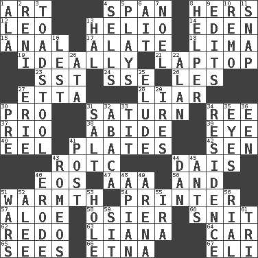 ACROSS 1. Nonscientific branch of learning 4. Connect, as a bridge 8. Possessive pronoun 12. Lion 13. Sun: prefix 14. Locale of original sin 15. Of or related to the anus 17. Having winglike extensions 18. Pale green bean 19. Under perfect conditions 21. Portable computer 23. Fast jet (abbr.) 24. Compass dir. 26. French article 27. Singer James 28. One who doesn't tell the truth 30. Adept person 31. Titan orbits this 34. To sift 37. _ de Janeiro 38. Remain 39. Sight organ 40. Snakelike fish 41. Food holders 42. Elected rep. 43. College mil. group 44. Raised platform 46. Greek goddess of the dawn 47. Auto club (abbr.) 50. Added to 51. Heat 54. Hard copy producer 57. _ vera 58. Flexible twig of a willow tree 60. In a ____ (agitated or irritated) 62. Redecorate 63. Climbing, woody, usually tropical vines 64. Automobile 65. Perceives with the eye 66. Inactive volcano in Sicily 67. Connecticut Ivy Leaguer DOWN 1. Wing 2. Painter Guido (1575-1642) 3. Inedible or poisonous agaric 4. Makes a sale 5. Romps 6. Small island 7. Christmas carol 8. Assistant 9. Proofreads 10. San ____ (Riviera town) 11. Fastener 13. Actor Linden 16. For fear that 20. _ moment's notice (2 wds.) 22. Actor Alda or Thicke 25. Evade 27. 4th largest of the Great Lakes 29. Angers 30. Before (prefix) 31. Table seasoning 32. Phillipine bananalike plant 33. Teat (slang) 34. Home 35. Sight organs 36. Car or cant ending 41. Mail 43. Lover boys 44. One of the 12 tribes of Israel 45. Pismires 46. Wear away 48. Bee-related 49. Sports stadium 51. Armed conflicts 52. Toward shelter 53. Hollow 55. Lyricist Gershwin 56. Monetary unit of Yemen 59. Be seated 61. Three (prefix)