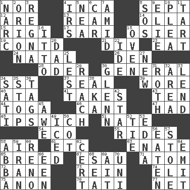 ACROSS 1. Not either 4. South American Indian 8. Back-to-school mo. 12. "We ___ not amused" (Victoria) 13. 480, 500 or 516 sheets of paper 14. Spanish pot 15. Swiss mountan, "Queen of the Mountains" 17. Indian skirt 18. Flexible twig of a willow tree 19. Continued (abbr.) 21. HTML Container Element 23. Consume 24. Relating to or accompanying birth 26. Lair 28. Baltic tributary 30. Commissioned military rank 34. Fast jet (abbr.) 37. Lick closed 39. Had on 40. _ moment's notice (2 wds.) 41. Proceeds 43. "___ Little Indians" 44. Ancient Roman robe 46. Patter 47. Possessed 48. NE Massachusetts town 51. Nathan's nickname 54. Environmental prefix 55. Amusement-park features 58. Wind 61. And so on (abbr.) 63. Related on the mother's side 65. A special lineage 67. Son of Isaac 71. Smallest unit of an element 72. Object of repulsion 73. It's straight from the horse's mouth 74. Biblical high priest 75. At once, immediately (arch.) 76. Jacques of French films 77. Fish or hair follower DOWN 1. Drug cop 2. Constellation of myth 3. Rain (Swedish) 4. Big collection agency 5. Teachers' org. 6. 4-wheeled motor vehicle 7. Among 8. Distress signal 9. Writer Wiesel 10. Entreaty 11. Small pie 16. "Tell ____ the Marines!" 18. Baking chamber 20. June honoree 22. Binary compound 25. For fear that 27. ___ Haven, CT 29. Arrive at 30. American astronaut and politician John 31. Writer of Portnoy's Complaint (1969) 32. Length times width 33. Grant temporary use of 34. Suttee (variant) 35. Cease 36. Labels 38. Alias (abbr.) 42. Play the lead 45. Deep reverence 49. On the rocks 50. Small bed 52. Neckwear 53. Pulitzer Prize-winning author Ferber 56. Ingested 57. Took without asking 58. Swedish rock group 59. SW Asia republic 60. Western Nevada city 62. Foregone conclusion 64. Send forth 66. Car or cant ending 68. Ocean 69. Small island 70. Corn or form start