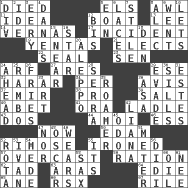 ACROSS 1. Passed on 5. Raised railways 8. Leather borer 11. The content of cognition 12. Water vessel 13. Area sheltered from the wind 14. Actresses Bloom and Felton 17. Event 19. Gossips 21. Chooses 22. Lick closed 23. Elected rep. 24. Sandy's bark 27. Ancient Greek god of war 29. Compass dir. 32. Ethiopian city, capital of Harari 34. For each 36. Advice 37. Arab leader 38. Adept person 39. Table seasoning 40. Collude with 41. Mouth or opening 42. Dipping utensil 43. Two (Sp.) 44. Mine, in Marseilles 46. Curvy letter 47. Immediately 50. Dutch treat 52. Full of chinks, cracks, or crevices 55. Pressed 57. Cloudy 59. Food allowance for one day 62. Bit 63. Ancient river in northeast Turkey 64. Singer Brickell 65. One (Scot) 66. Acura sports coupe 67. Cause heat under the collar DOWN 1. HTML Container Element 2. Binary compound 3. Suggestive of the supernatural 4. Natives or inhabitants of Denmark 5. A really long time 6. Shoestrings 7. Vertical member of a panel or frame 8. Actor Baldwin 9. Left 10. Allows 12. Twice 15. Approach 16. Play the lead 18. Lair 20. City in Syria 24. Toward the future 25. Role for Stallone 26. Strips of potato fried in deep fat 28. Father Junipero _ 29. Dodge 30. Beverly of Met fame 31. _____ Park, CO 33. Nonscientific branch of learning 35. Wanderer 36. White ___ sheet 42. Climbing, woody, usually tropical vines 45. Aroma 47. And not 48. Motion picture award 49. Erodes 51. Distance measurement 52. Round or rotation of duties 53. _ the terrible 54. Ancient Persian 55. ___ a Wonderful Life 56. "You Light Up My Life" star Conn 58. Saxophone 60. Lubricate 61. Born