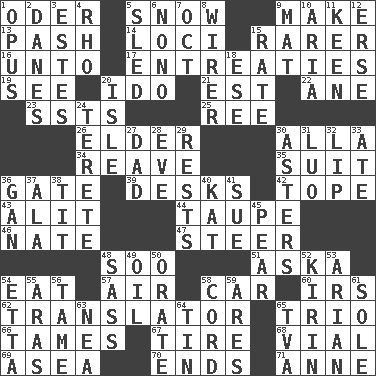 ACROSS 1. River in Europe 5. Overwhelm 9. Cause to be 13. Romantic infatuation 14. Venues 15. More valued for its uncommonness 16. To (old English) 17. Pleas 19. Perceive with the eye 20. Wedding promise 21. Eastern Standard Time (abbr.) 22. One (Scot) 23. Fast planes 25. To riddle 26. A person who is older than you are 30. Silent film actress Nazimova 34. Break or tear apart 35. Costume for a special activity 36. Yard entry 39. Writing tables 42. Drink excessively 43. Came down and settled, as after flight 44. Grayish beige 46. Nathan's nickname 47. Guide 48. "Barney Miller" actor Jack 51. "____ silly question..." 54. Erode 57. Wind 58. Auto 60. Big collection agency 62. Interpreter 65. Musical group of three 66. Softens 67. Become fatigued 68. Small bottle 69. Toward the sea 70. Extremities 71. Queen of England 1702-14 DOWN 1. Musical composition 2. Natives or inhabitants of Denmark 3. _____ Park, CO 4. 17th letter of the Greek alphabet 5. Downhill vehicle 6. Words to Nanette 7. Sep. follower 8. One who wires 9. Floor protector 10. Operatic vocal solo 11. Peachy ____! 12. Celtic language 15. Assign a rank or rating to 18. Compass dir. 20. Small island 24. Cigar-shaped 27. June honoree 28. Night before a holiday 29. Musical pauses 30. Michaelmas daisies 31. Nilotic language 32. Mouth edge 33. Had dinner 36. Separate the seeds from cotton 37. Chicken ___ king 38. Teat (slang) 40. Krazy ___ of comics 41. Take to court 45. Lightbulb-shaped fruit 48. Backtalk 49. Lubricate 50. Declaim 52. Japanese brewing company 53. Believer in; advocate of (suffix) 54. Singer James 55. Ancient river in northeast Turkey 56. Docile 58. Drawstring 59. Ancient Greek god of war 61. Not divided or shared with others 63. Teachers' org. 64. Shallow baking pan 65. Federal power corp.