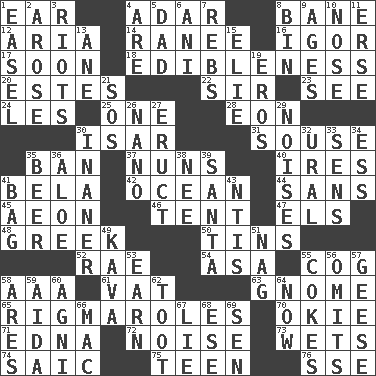 ACROSS 1. Hearing organ 4. The sixth month of the Jewish calendar 8. Object of repulsion 12. Roberta Peters solo 14. Indian princess (variant) 16. Russian composer Stravinsky 17. Within a short period 18. The property of being fit to eat 20. _____ Park, CO 22. Title for a knight 23. Observe 24. French article 25. Single 28. Period of immesurable duration 30. Austrian river, tributary to the Danube 31. Boozer 35. Bar 37. Religious women 40. Angers 41. Actor Lugosi 42. Sea 44. Without 45. A really long time 46. Portable shelter 47. Raised railways 48. Hellenic 50. Airtight sealed metal containers 52. Actress Charlotte 54. White ___ sheet 55. Gear tooth 58. American Automobile Association (abbr.) 61. Large container 63. Dwarf 65. Complicated, petty procedures 70. Migrant worker of the '30s 71. Pulitzer Prize-winning author Ferber 72. Annoying sound 73. Moistens 74. Ketch in the Levant 75. Adolescent 76. Compass dir. DOWN 1. Artist's stand 2. Came up 3. Debaucheries 4. "We ___ not amused" (Victoria) 5. Male parent 6. Cuckoo 7. Confederate soldiers (slang) 8. Storage container 9. Eons 10. Sense of smell 11. Celtic language 13. A saturated hydrocarbon 15. Writer Wiesel 19. Greek god of love 21. Mayday 26. Billionth: prefix 27. Spew [out] 29. Annoying sounds 30. More empty; more void 32. Mountain range 33. Elected reps. 34. Double-curved letter 35. Fermented drink made from hops 36. _ vera 38. Born 39. Before Barbara or Clara 41. Container for groceries 43. Nuclear Threat Initiatives 49. Polynesian shrub of the pepper family 51. Tired old horse 53. Merit 55. Popular sodas 56. Leaves out 57. Honkers 58. Ancient Greek god of war 59. Opera by Verdi 60. Hindu god of fire 62. A blast of a horn 64. Immediately 66. Big _ 67. Untruth 68. Compass dir. 69. Elected rep.