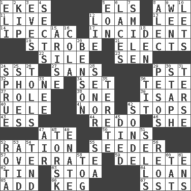 ACROSS 1. Makes supply last 5. Raised railways 8. Leather borer 11. Moving, as bait 12. Rich soil 13. Area sheltered from the wind 14. Medicinal drug used to evoke vomiting 17. Event 19. Disco prop 21. Opts 22. Drop; flow; fall 23. Elected rep. 24. Fast jet (abbr.) 27. Without 29. Pacific Standard Time (abbr.) 32. Give a jingle 34. Arrange properly for use 36. Wig 37. Hero or heavy, e.g. 38. Single 39. Austrian river, tributary to the Danube 40. Ubangi River tributary 41. Not either 42. Closes up, plugs up 43. Double-curved letter 44. Redecorate 46. A female animal or person 47. Had dinner 50. Canisters 52. Food allowance for one day 55. Sowing specialist 57. Make much ado about nothing 59. Keyboard key 62. Metal container 63. Portico 64. Grant temporary use of 65. Say or write further 66. Cask 67. Fast planes DOWN 1. Connecticut Ivy Leaguer 2. Sleep 3. Nights before holidays 4. Religious groups 5. Period of immesurable duration 6. Shoestrings 7. Grin 8. Actor Baldwin 9. Left 10. Allows 12. Untruth 15. Get up 16. Root beer relative 18. Lair 20. Gillaume's butler role 24. Upset 25. Imelda's hoard 26. For Whom the Bell _____ 28. Sir (Sp.) 29. Mexican monetary units 30. Staphylococcus 31. Laconic 33. Born 35. Cigar-shaped 36. Teat (slang) 42. Something which is sent 45. Passed on 47. Atmosphere 48. Cod relative 49. Related on the mother's side 51. Exchanges for money 52. Round or rotation of duties 53. Enthusiastic 54. Watch over 55. Ocean 56. Vintage cars 58. Coat; cloak 60. Make lace 61. Followers of ems