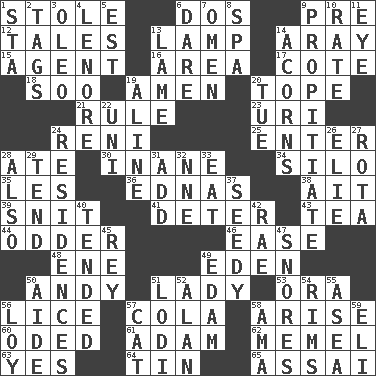 ACROSS 1. Took without asking 6. Two (Sp.) 9. Before (prefix) 12. Falsehoods 13. Desk light 14. Like ___ of sunshine 15. Rep 16. Type of rug 17. ____ d'Azur (French Riviera) 18. "Barney Miller" actor Jack 19. So be it 20. Drink excessively 21. Court order 23. RI univ. 24. Painter Guido (1575-1642) 25. Keyboard key 28. Had dinner 30. Lacking in sense or substance 34. Grain storage tower 35. French article 36. Ferber et al. 38. Small island 39. In a ____ (agitated or irritated) 41. Prevent from occurring 43. Beverage made from leaves 44. More peculiar 46. Relaxation 48. Compass dir. 49. Locale of original sin 50. "60 Minutes" Commentator Rooney 51. Kenny Rogers chart-topper in '80 53. Mouth or opening 56. Louse (plural) 57. Root beer relative 58. Get up 60. Wrote a lyric poem 61. First of billions? 62. Klaipeda city 63. Affirmative reply 64. Metal container 65. Slender Brazilian palm DOWN 1. R.R. building 2. Labels 3. Butter sub 4. Poe poem 5. Eastern Standard Time (abbr.) 6. Have the gumption 7. Sign of things to come 8. Health resort 9. Appease 10. Pace 11. Sight organ 13. Unable to walk 14. Oak nuts 19. Place in a line 20. Third day of the wk. 22. Single; one (prefix) 24. Dwellings 26. Writer Wiesel 27. Roll call or roster of names 28. In addition 29. Be inclined (to) 31. Find the sum of 32. Compass dir. 33. Consume 37. Shabby and untidy 40. Looked after 42. Actress Charlotte 45. Marina Del _, California 47. Sounds asleep 49. Dutch treat 50. Helper 51. Farming town in central California 52. ____ Jay Lerner 54. Basketball hoops 55. Toward the sea 56. Myrna of the movies 57. Feline 58. Wet nurse (var.) 59. Connecticut Ivy Leaguer