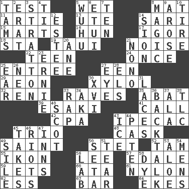ACROSS 1. Trial 5. Soggy 8. Floor protector 11. Nick name for Arthur 13. Shoshoni 14. Indian skirt 15. Shops 16. Attila the _ 17. Russian composer Stravinsky 18. R.R. building 19. "Change" in Tahitian 21. Annoying sound 22. Adolescent 24. Single time 25. Main course 27. Car or cant ending 29. A really long time 30. Xylene (variant) 32. Painter Guido (1575-1642) 33. All-night dance parties 35. Blind as ____ 39. 1973 Nobel Price Winner (Physics) Leo 41. Give a ring to 42. Tax preparer (abbr.) 43. Medicinal drug used to evoke vomiting 45. Musical group of three 48. Keg 49. Virtuous person 50. Proofreading order 52. Scottish cap 55. Picture 56. Area sheltered from the wind 57. Peak District village in England 59. Allows 60. "One Day ___ Time" 61. High-strength synthetic material 62. Curvy letter 63. Long, evenly shaped piece 64. Supplements with great effort DOWN 1. Scottish caps 2. Part of Q.E.F. 3. Ski resort town in Vermont 4. Teat (slang) 5. Chinese city south-southwest of Nanjing 6. Needle holder 7. Nine, plus one 8. Mysterious quality of enchantment 9. Came up 10. Hoop that covers a wheel 12. First name in cosmetics 14. The Jewish people; Israel 20. A saturated hydrocarbon 21. Words to Nanette 23. Bert's buddy 25. Hearing organ 26. Born 27. Sight organ 28. Raised railways 30. 16 31. Shoestrings 33. Strike 34. Alias (abbr.) 36. Sass 37. In the manner of 38. Affectionate concern, for short 40. Native of Scotland 43. Frozen water 44. Eucharist need 45. Receives possession of 46. Debaucheries 47. Lodging establishments 49. Filth; sediment 50. Stalk of a moss capsule 51. Lacerate 53. Medicinal plant 54. Not women's 56. Experiment locale 58. Color